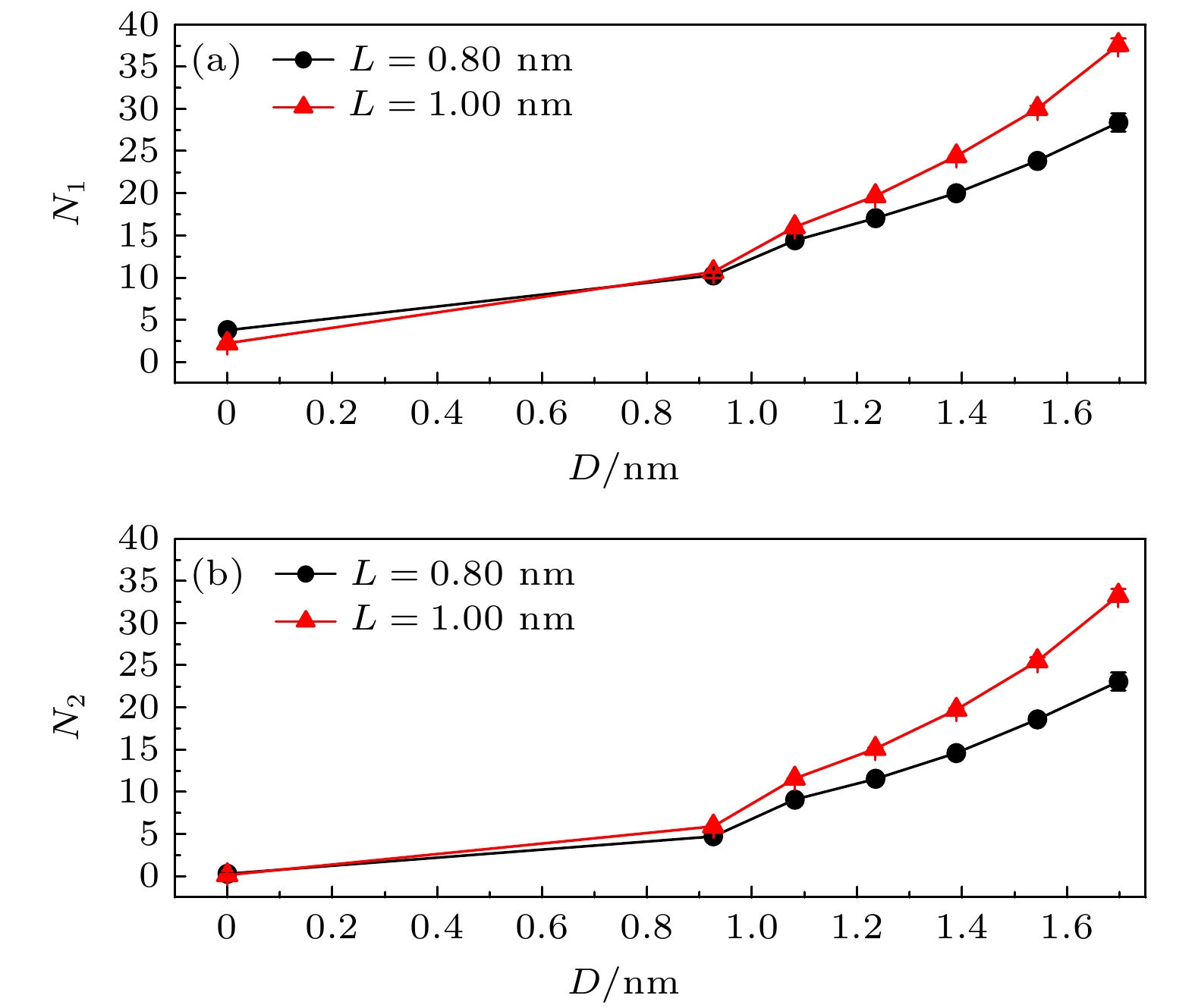 图 4 (a), (b) 当L = 0.80, 1.00 nm时, 断裂纳米管内的水分子与纳米管间勒纳德-琼斯势能是位置z的函数; (c)勒纳德-琼斯势能尖峰相对于D = 0 nm的断裂纳米管下降程度
