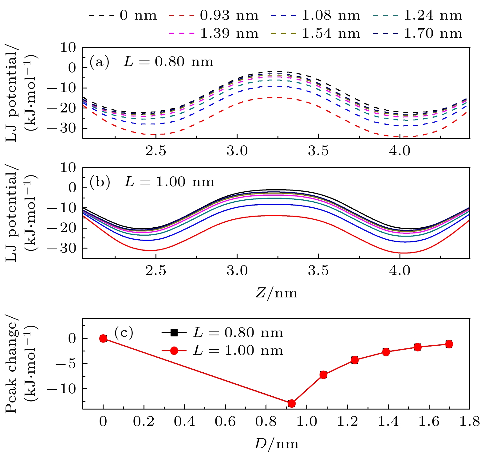 Figure 4. (a), (b) The Lennard-Jones potential between water molecules and the disjoint nanochannel for L = 0.80, 1.00 nm as a function of position (z), respectively; (c) the peak change of the Lennard-Jones potential between water molecules and the disjoint nanochannel for L = 0.80, 1.00 nm compared to the peak of the interaction in the disjoint nanochannel with D = 0 nm, respectively.