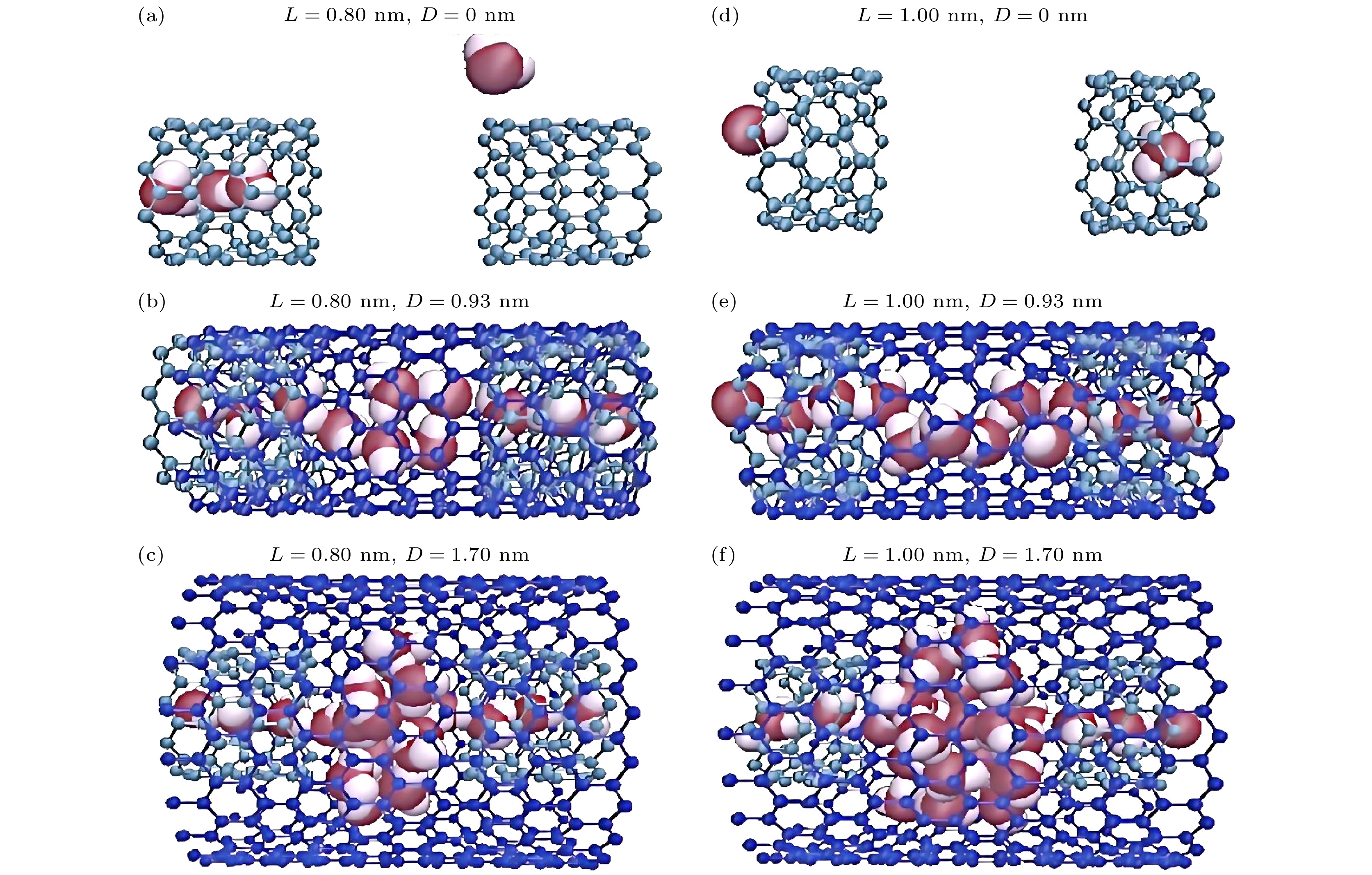 图 5 (a)—(c) D = 0, 0.93, 1.70 nm时, L = 0.80 nm的断裂纳米管内的水分子的结构图; (e)—(f) D = 0, 0.93, 1.70 nm时, L = 1.00 nm的断裂纳米管内的水分子的结构图