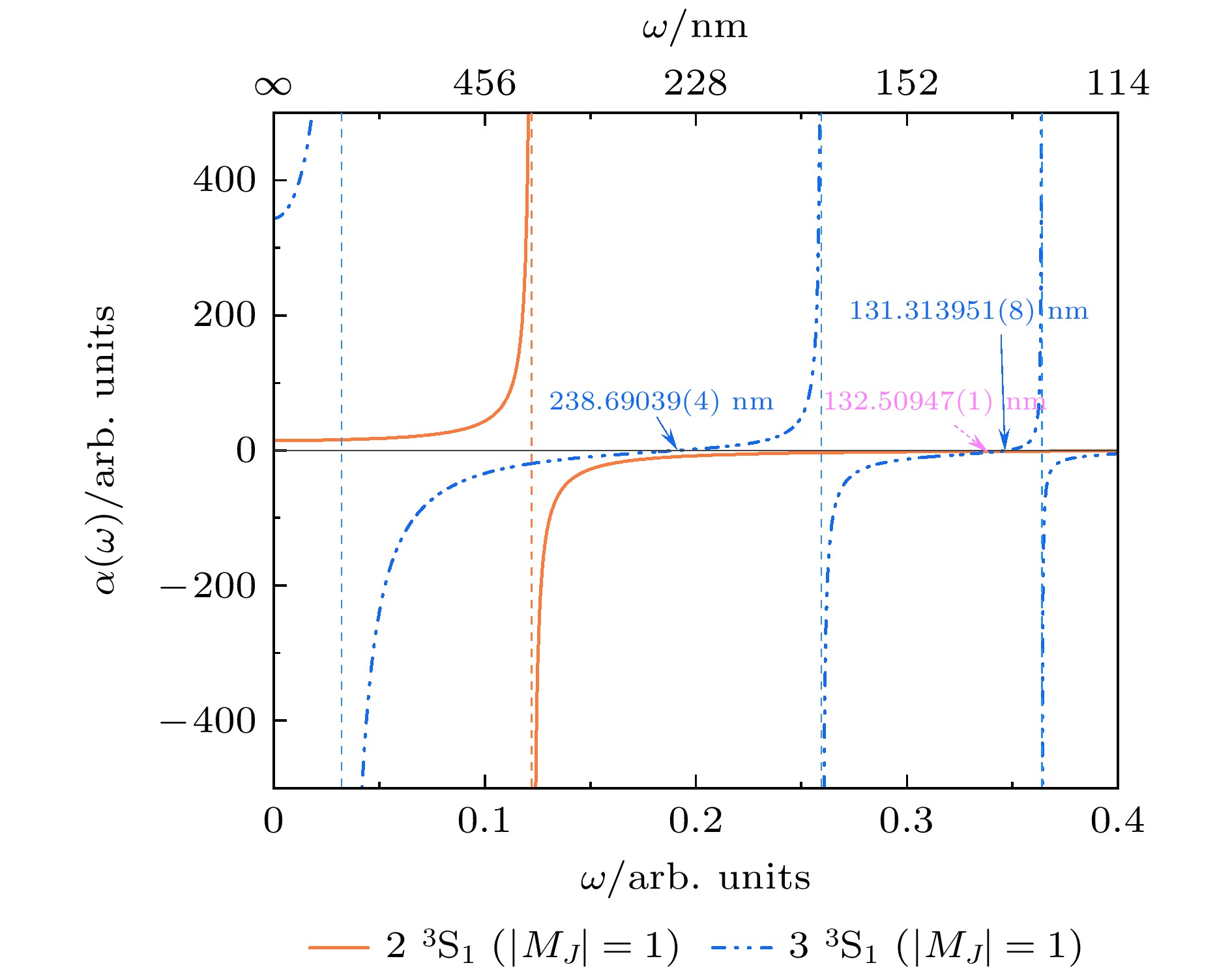 图 1 11Be2+离子$2^3 {\mathrm{S}}_1$和$3^3 {\mathrm{S}}_1$态$|M_{J}|=1$磁子能级的动力学电偶极极化率, 垂直虚线表示共振位置. 橘黄色和蓝色数字分别表示$2^3 {\mathrm{S}}_1(|M_{J}|=1)$和$3^3 {\mathrm{S}}_1(|M_{J}|=1)$态的幻零波长, 玫红色数字表示使$2^3 {\mathrm{S}}_1(|M_{J}|=1)$和$3^3 {\mathrm{S}}_1 $$ (|M_{J}|=1)$态极化率相等的魔幻波长