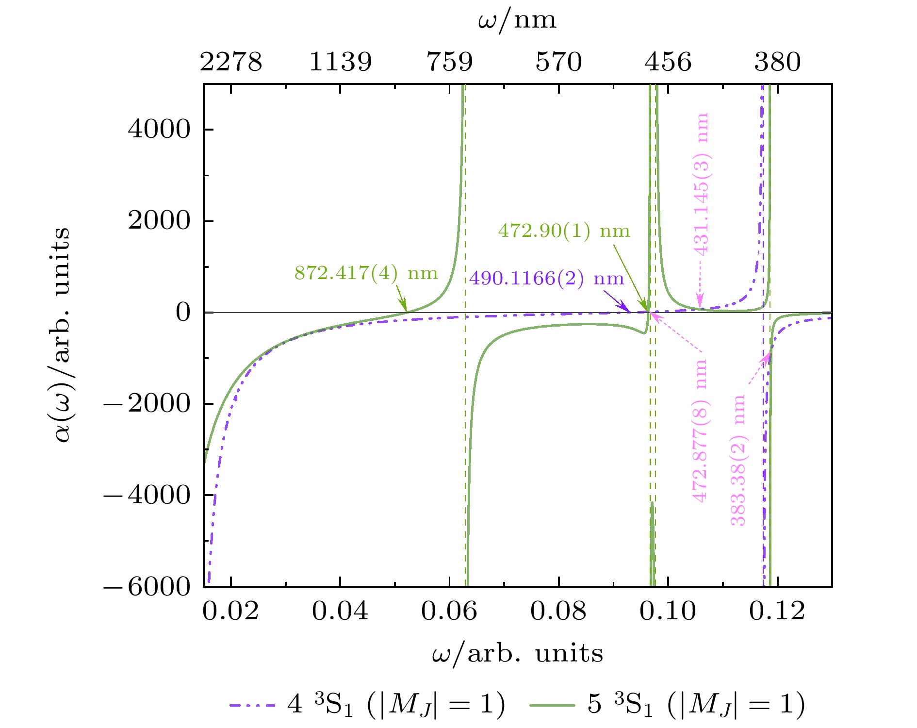 图 2 11Be2+离子$4^3 {\mathrm{S}}_1$和$5^3 {\mathrm{S}}_1$态$|M_{J}|=1$磁子能级的动力学电偶极极化率, 垂直虚线表示共振位置. 紫色和绿色数字分别表示$4^3 {\mathrm{S}}_1(|M_{J}|=1)$和$5^3 {\mathrm{S}}_1(|M_{J}|=1)$态的幻零波长, 玫红色数字表示使$4^3 {\mathrm{S}}_1(|M_{J}|=1)$和$5^3 {\mathrm{S}}_1(|M_{J}|= 1)$态极化率相等的魔幻波长