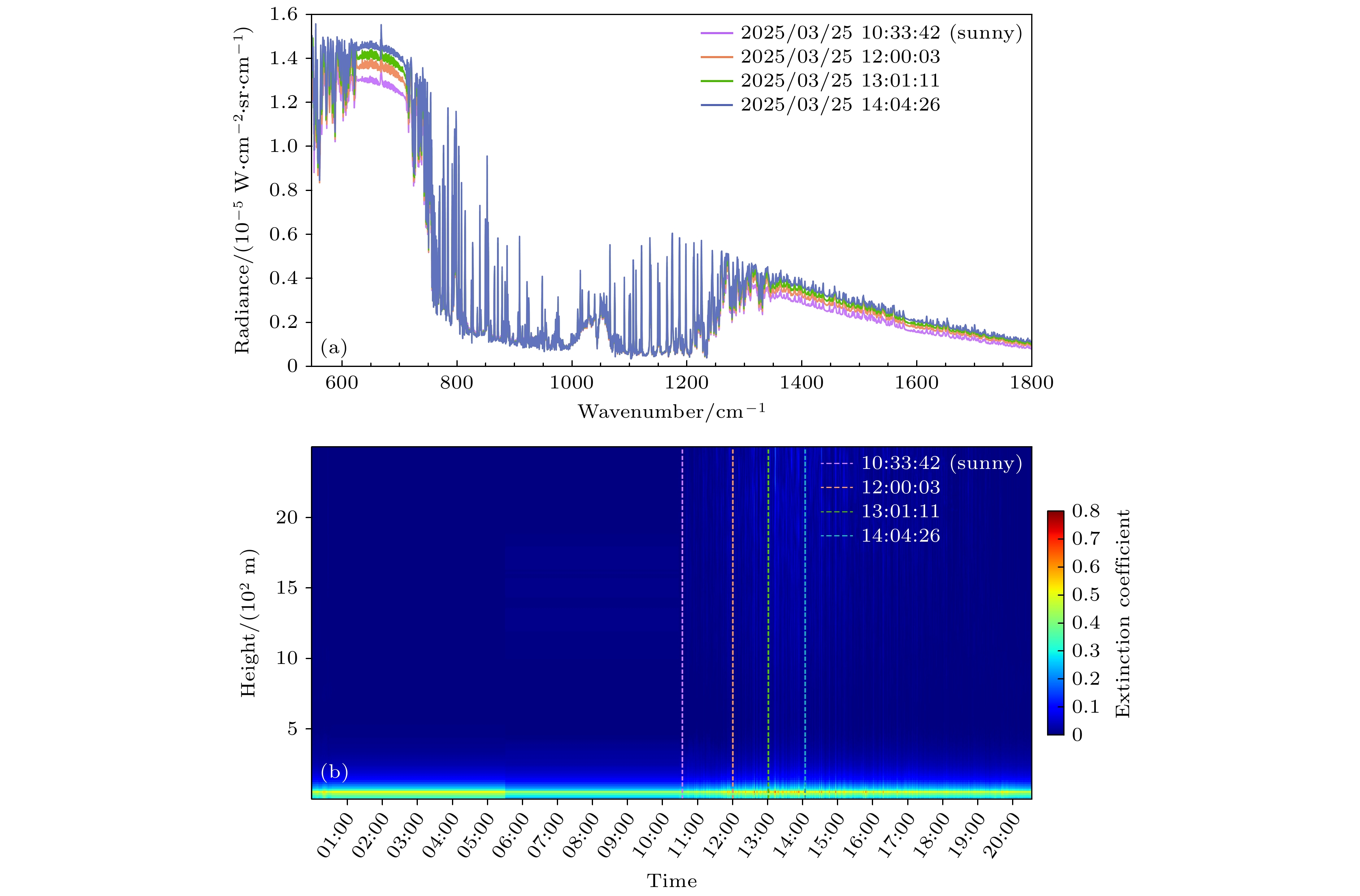 图 10 在2025年3月25号不同时刻, ASSIST在墨脱测得的晴空和薄雾光谱 (a) ASSIST测得的光谱; (b) 激光雷达探测的云和气溶胶总消光系数结果