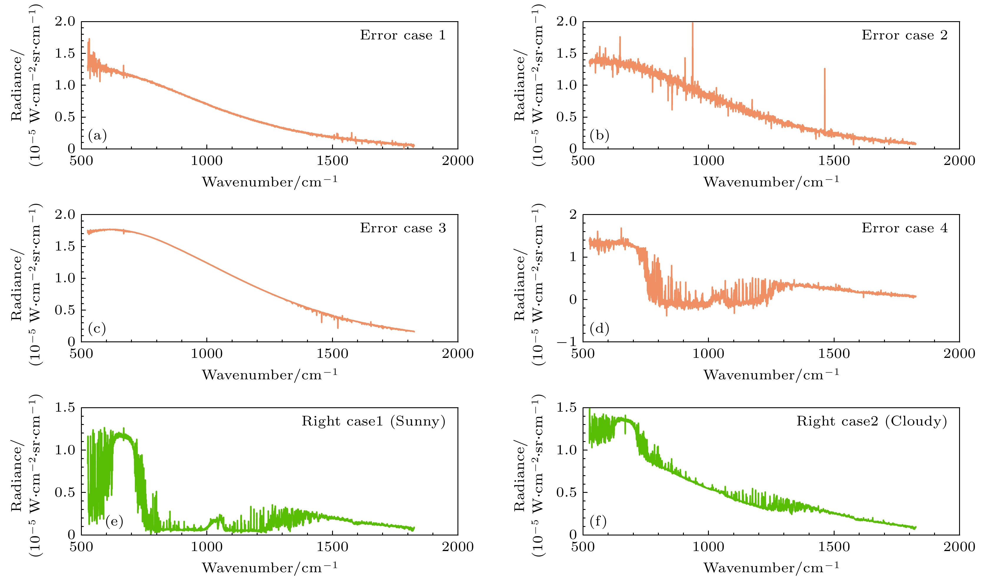 Figure 2. Several erroneous spectra (orange lines) and correct spectra (green lines) measured by ASSIST: (a), (b), (c), (d) respectively represent the four types of erroneous spectra collected; (e), (f) respectively represent the correct spectra collected under clear sky and cloudy conditions.