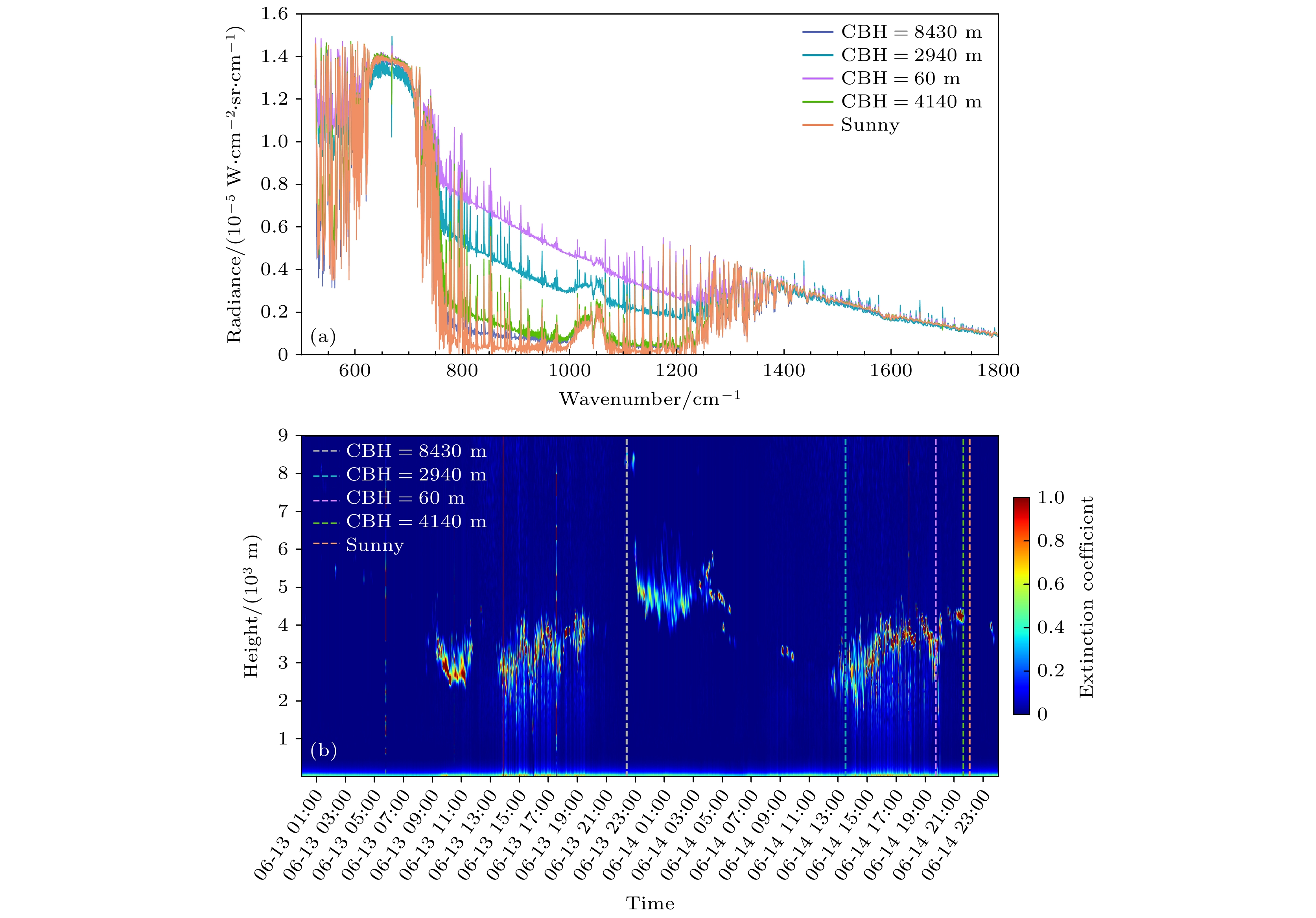 Figure 8. The results of the ASSIST measurements of clear sky and cloudy spectra, as well as the total extinction coefficients of clouds and aerosols detected by the lidar under different CBH conditions: (a) The clear sky and cloudy spectra measured by ASSIST; (b) the total extinction coefficient results of clouds and aerosols detected by lidar.