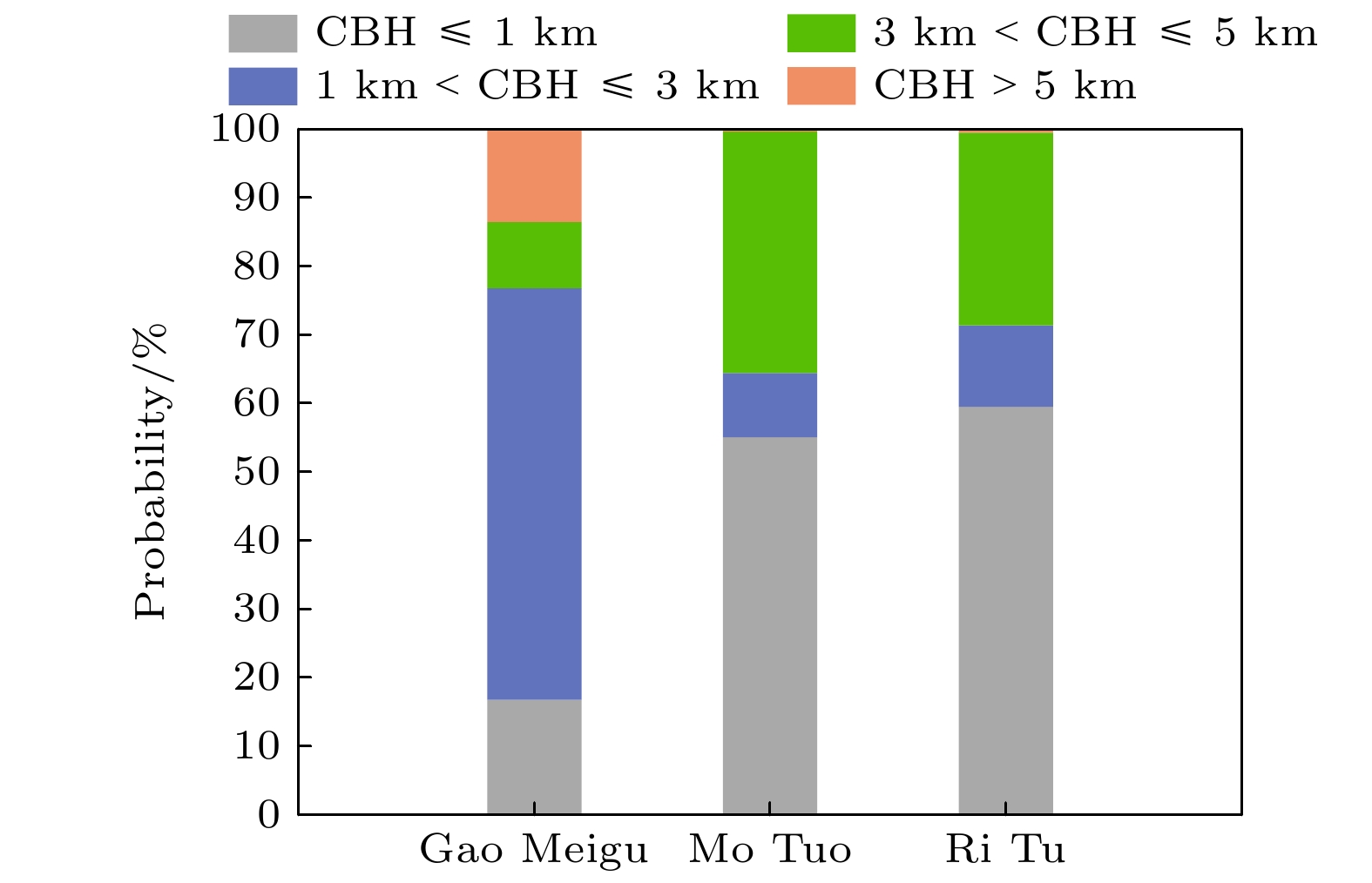 不同CBH 方法 PC/% TPR/% FNR/% ${\text{CBH}} \leqslant 1{\text{ km}}$ 原始方法 98.53 98.53 1.47 新方法 99.26 99.26 0.74 $ 1{\text{ km}} < {\text{CB}}H \leqslant 3{\text{ km}} $ 原始方法 96.43 96.43 3.57 新方法 97.62 97.62 2.38 ${\text{3 km}} < {\text{CBH}} \leqslant 5{\text{ km}}$ 原始方法 95.45 95.45 4.55 新方法 98.64 98.64 1.36 ${\text{CBH}} > 5{\text{ km}}$ 原始方法 87.50 87.50 12.5 新方法 91.67 91.67 8.33 -
