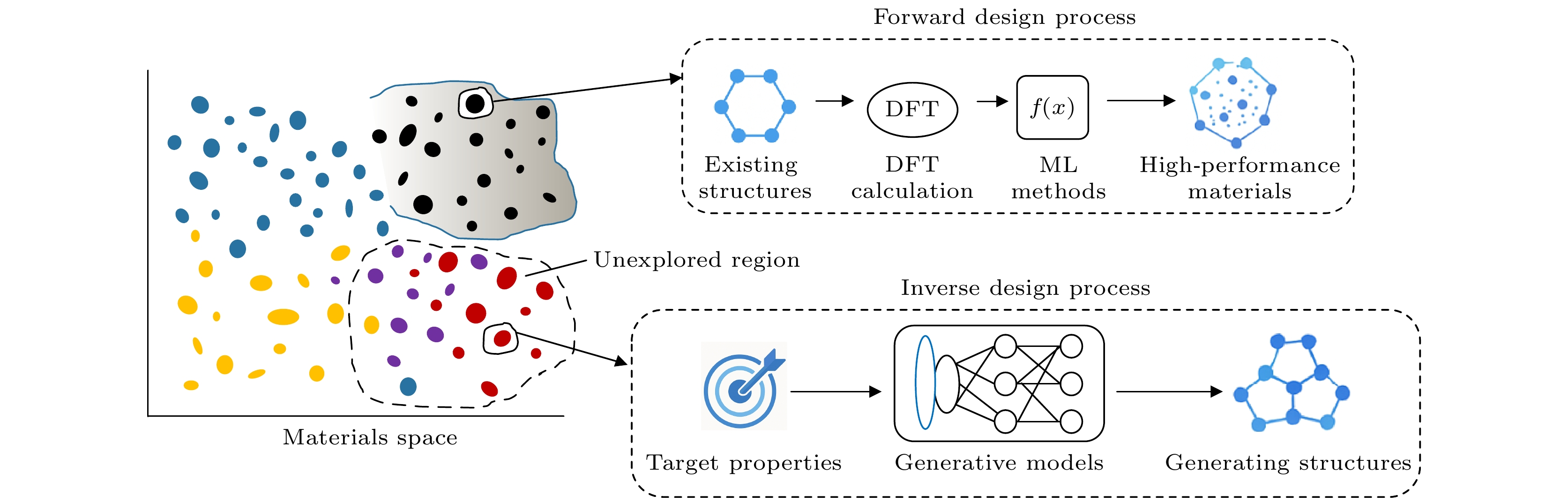 Figure 1. Two paradigms of data-driven materials design: forward design and inverse design. The black region in the figure represents the explored part of the materials chemical space, the region with colored dots indicates the unexplored space, and the region with yellow dots denotes the potential high-performance materials. The forward design process (top) starts from known material structures and gradually screens candidate materials via first-principles calculations and machine learning predictions; the inverse design process (bottom) starts from target properties and directly generates candidate structures through generative models.