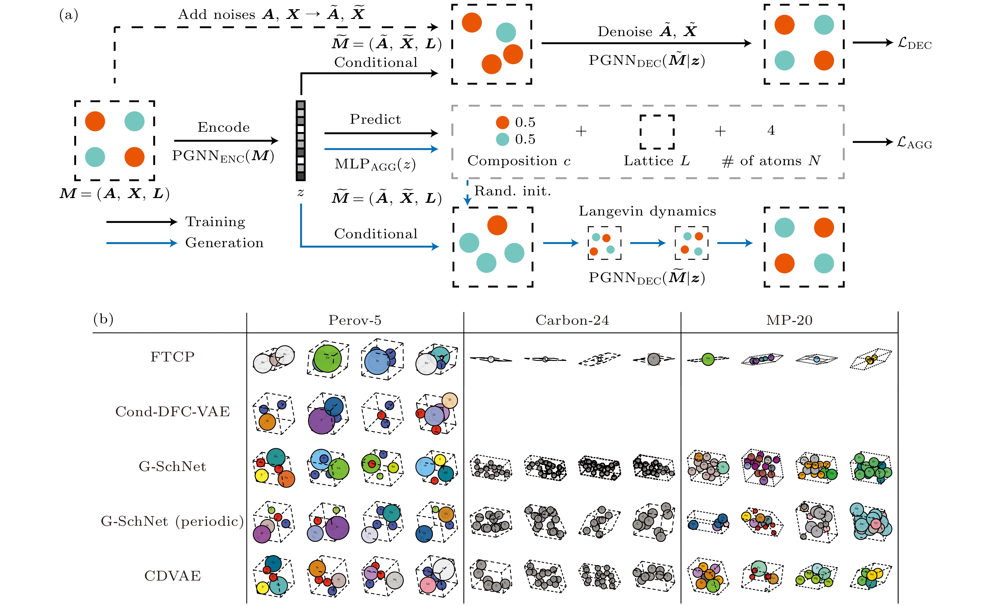 Figure 2. (a) Framework of the CDVAE[30]. The model takes the crystal graph representation as input, encodes it using a periodic graph neural network (PGNN) and predicts aggregated structural attributes through a property aggregation predictor. A score-based network[36] (implemented using PGNN in the decoder) combined with Langevin dynamics[37] is then used to generate stable three-dimensional crystal structures. (b) Crystal structures randomly generated by different generative models on different datasets.