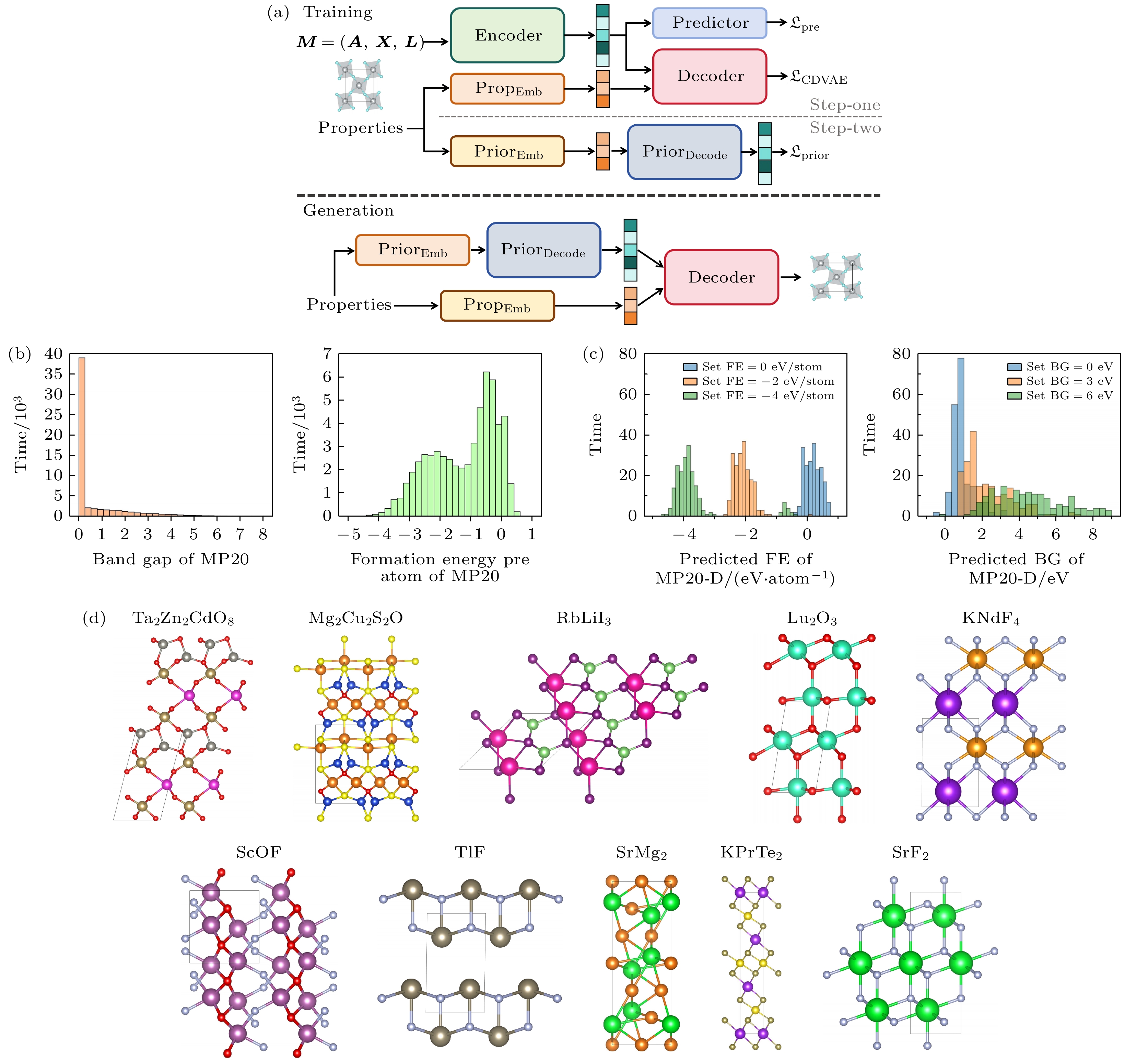 Figure 5. (a) Training and generation workflow of Con-CDVAE[22]. The training phase includes joint encoding of crystal structures and target properties via the encoder, a property predictor, and conditional decoding through the decoder. Simultaneously, a prior module [14,36] is trained to enable the generation of latent variable z from target property inputs. In the generation phase, a target property is first provided, from which a latent variable z is generated using the prior module. This latent variable is then concatenated with a property embedding vector obtained from the propemb module to derive the latent variable zcond conditioned on the target property, which is passed to the decoder to generate crystal structures. (b) Distribution of band gap and formation energy in the MP-20 training dataset[9]. (c) Property distributions of materials generated by Con-CDVAE under different target property settings. (d) Representative novel crystal structures generated by Con-CDVAE.