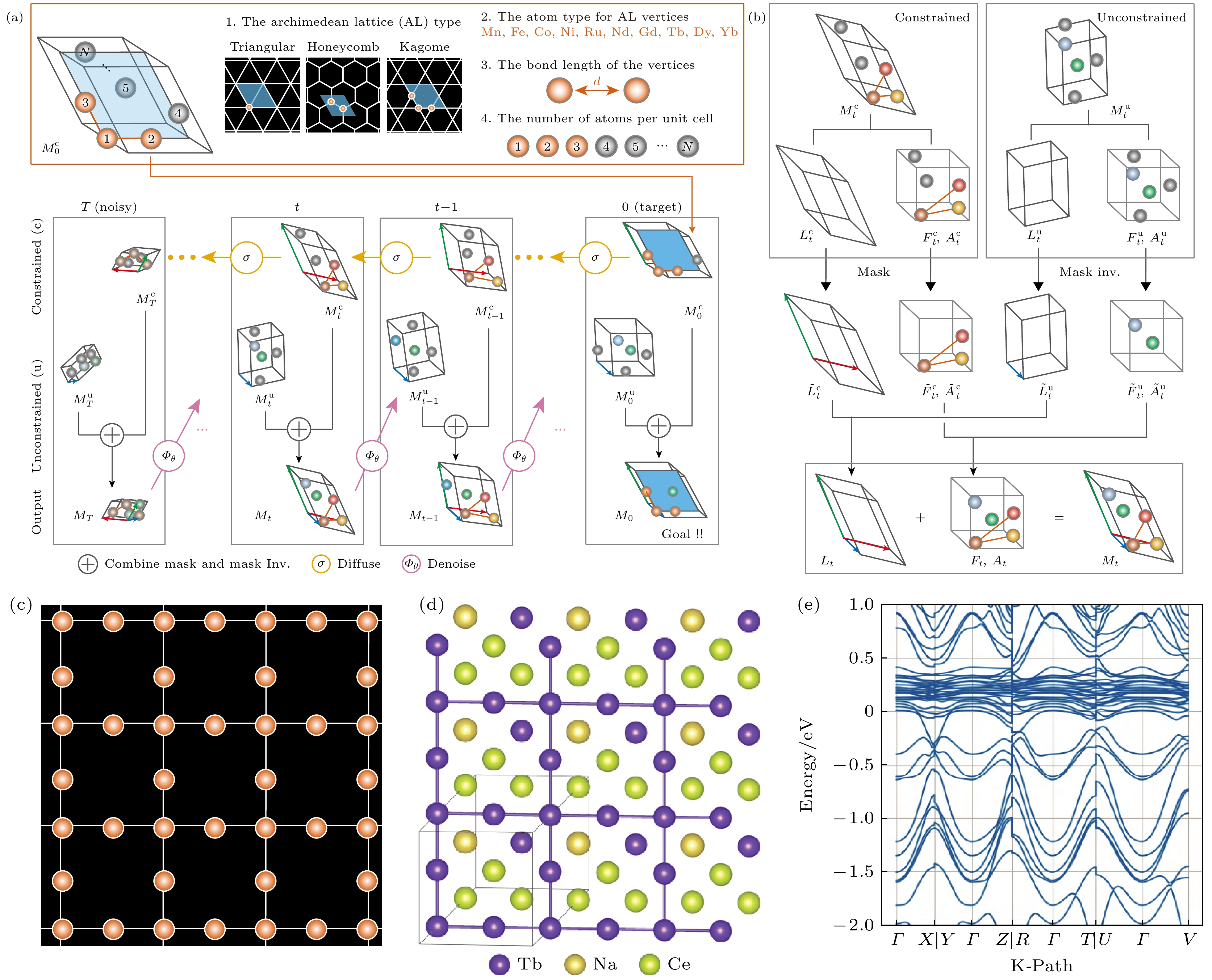 Figure 6. (a) Schematic illustration of the material structure generation process in the SCIGEN model[23]. The model is guided by geometric rules and utilizes a multi-step diffusion and denoising process, combined with a masking mechanism, to integrate geometrically constrained structures with unconstrained ones, thereby gradually guiding the generation toward the target structure. (b) Diagram showing the merging of constrained and unconstrained structures and the masking mechanism used in SCIGEN during structure generation. (c) A 2D schematic of the Lieb lattice. (d) A representative structure, Ce3NaTb4, generated by SCIGEN under Lieb lattice constraints. (e) Band structure of the generated Ce3NaTb4 material.