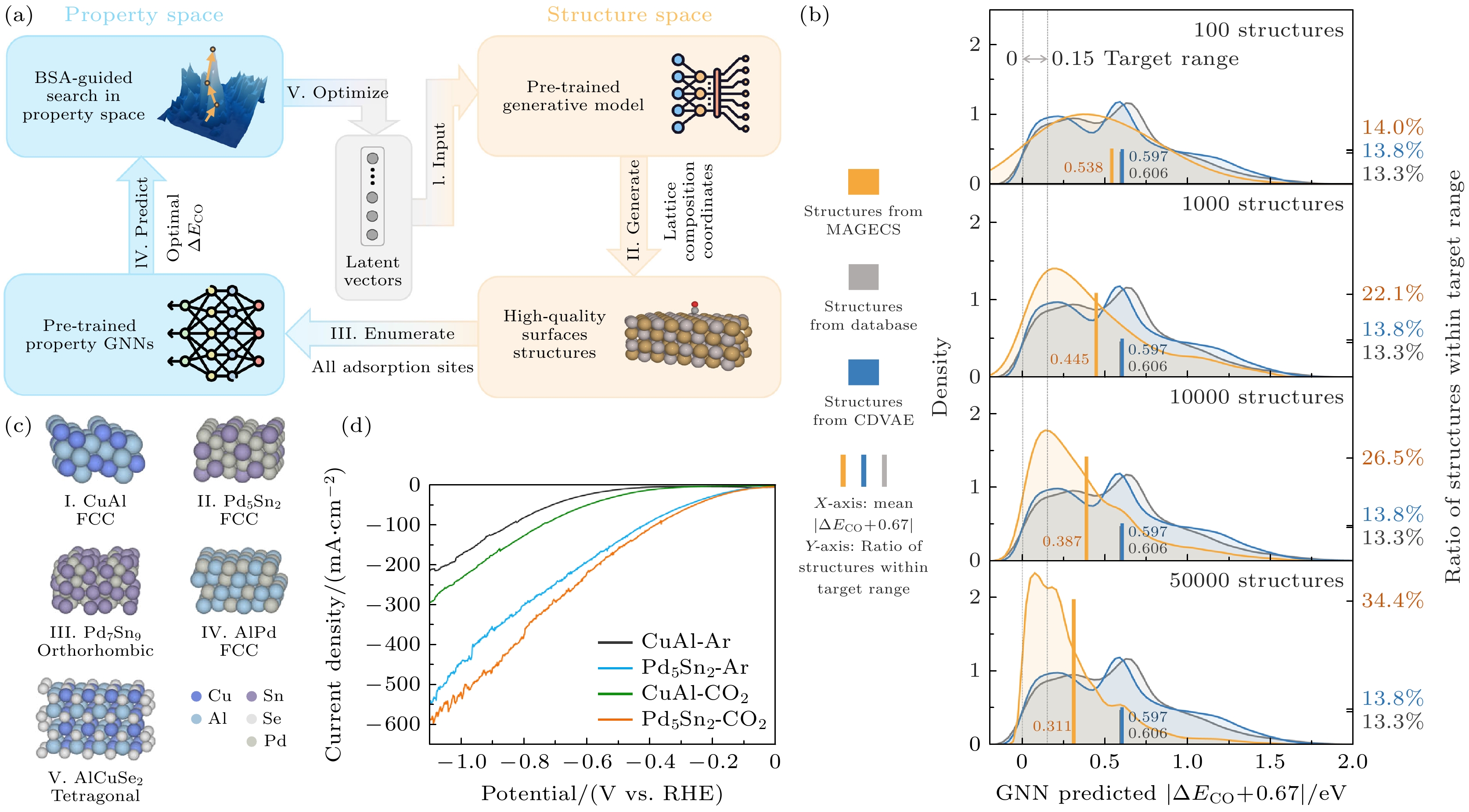 Figure 8. (a) Framework diagram of MAGECS (materials generation with efficient global chemical space search)[26]. The framework integrates a generative model (CDVAE), a supervised graph neural network (GNN), and a bird swarm algorithm (BSA) to search for optimal latent vectors in the latent space and generate materials that meet target properties. (b) Comparison of the distribution of structures from MAGECS, CDVAE, and the original database within the target property range $ | {\Delta {E_{{\text{CO}}}} + 0.67} | \leqslant 0.2{\text{ eV}} $. (c) Five target-property-aligned structures generated by MAGECS and successfully synthesized in experiments. (d) Electrocatalytic CO2 reduction performance curves of CuAl and Pd5Sn2.