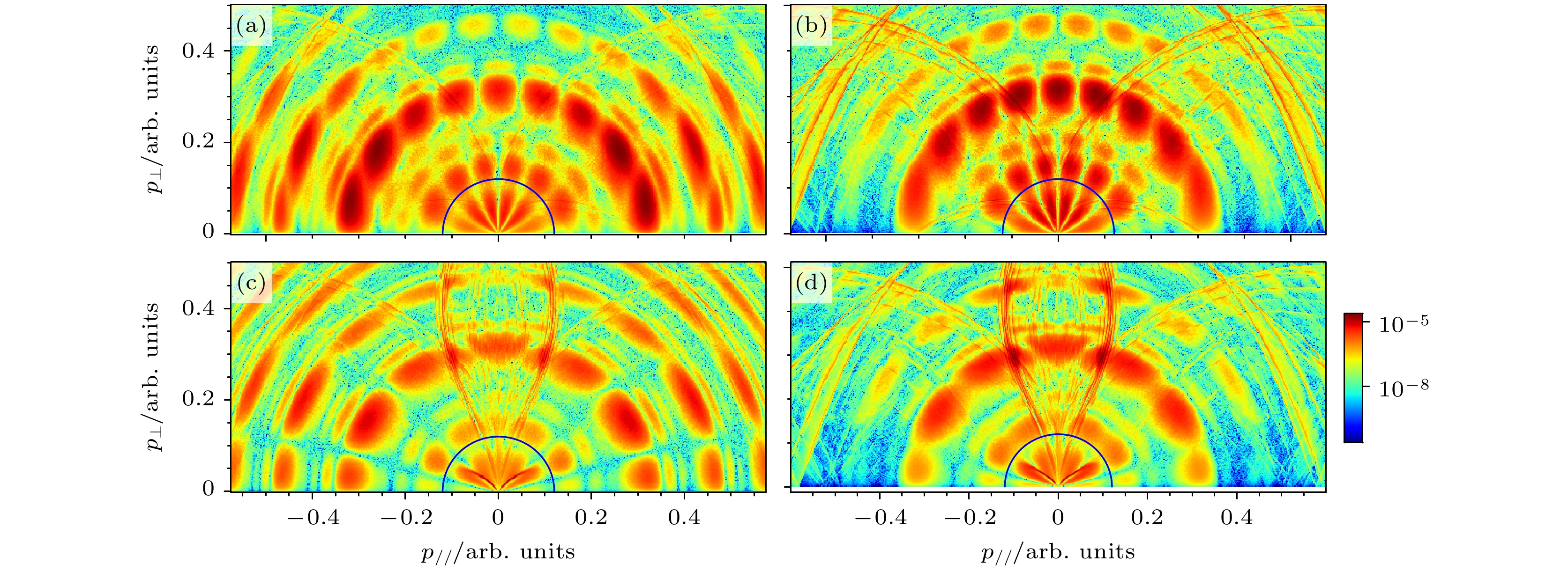 图 3 干涉机制解析. 仅Ⅰ+Ⅱ类(“直接”与前向散射)(a, b)和Ⅱ+Ⅲ类(全息对)(c, d)干涉的PMD. (a)(c) 含初始纵向动量, (b)(d) 不含. Ⅰ+Ⅱ类干涉的扇形结构基本不受初始动量影响, 而主导SFPH的Ⅱ+Ⅲ类干涉同样稳健