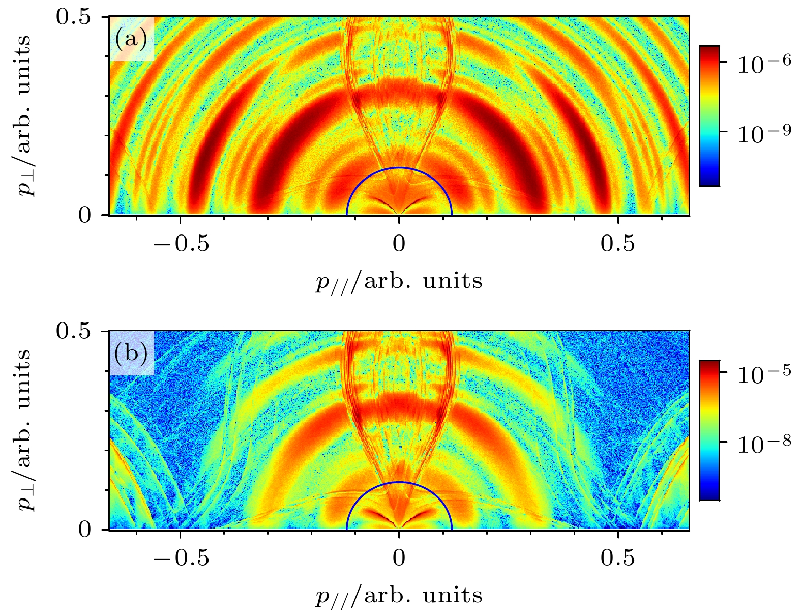 Figure 4. The physical origin of the corrected interference pattern. PMDs arising from the interference of only Category Ⅰ (“direct”) and Category Ⅲ (“glory” scattered) trajectories, calculated (a) with and (b) without the initial longitudinal momentum. A dramatic change is visible: including the initial momentum (a) correctly creates an interference minimum along the angle where the incorrect model (b) produced a prominent lobe (approx. $ 30^\circ $). This specific change is what corrects the overall lobe count in the full PMD.