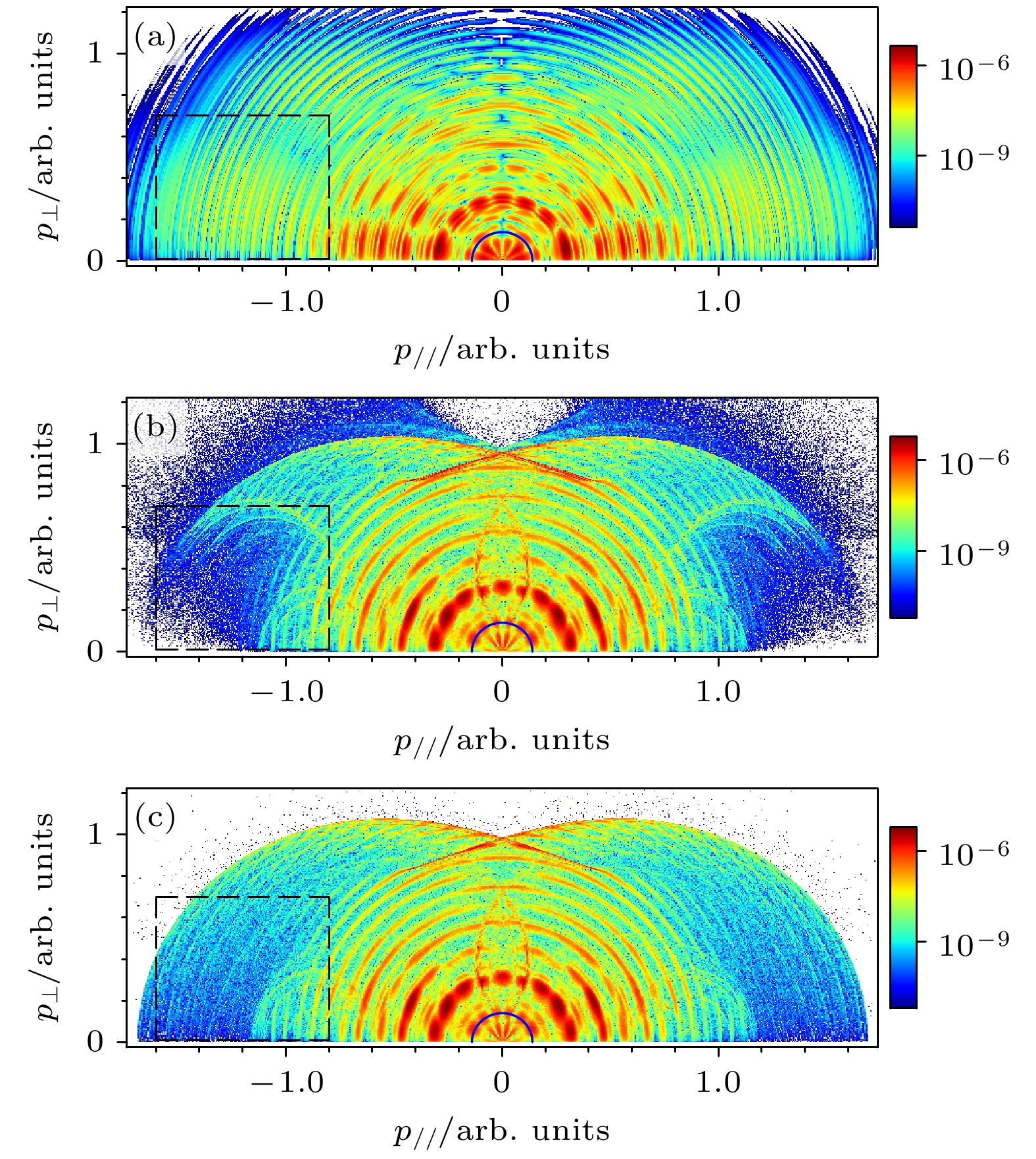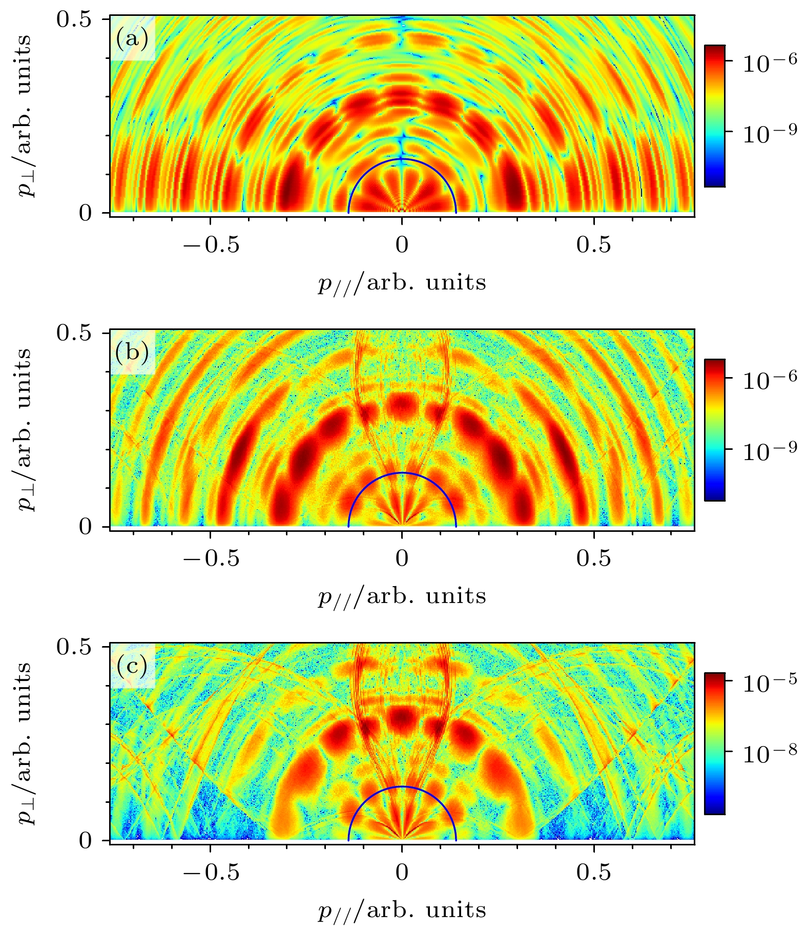 图 5 感应偶极势对较高能再散射结构的影响 (a) 含时薛定谔方程(TDSE)模拟(图2(a)放大版). (b) 不含感应偶极势的半经典模拟($ v_{0\parallel}\ne 0,\; U_{{\mathrm{ID}}} = 0 $)(图2(c)放大版). (c) 包含感应偶极势的非绝热半经典模拟($ v_{0\parallel}\neq 0,\; U_{{\mathrm{ID}}}\neq 0 $). 对比可见, 引入$ U_{{\mathrm{ID}}} $显著抑制了纯库仑势导致的尖锐焦散结构, 使结果(c)在定性上更接近TDSE基准(a)