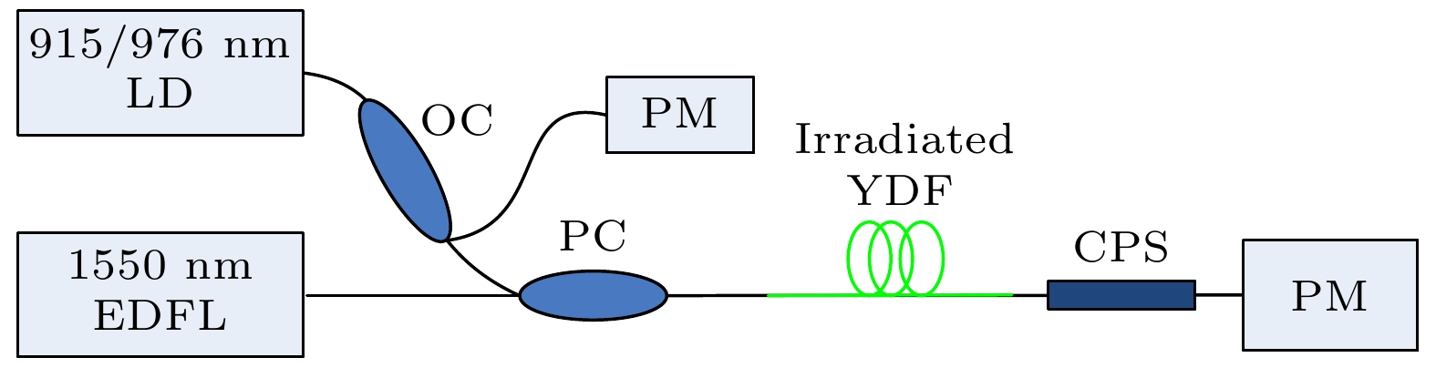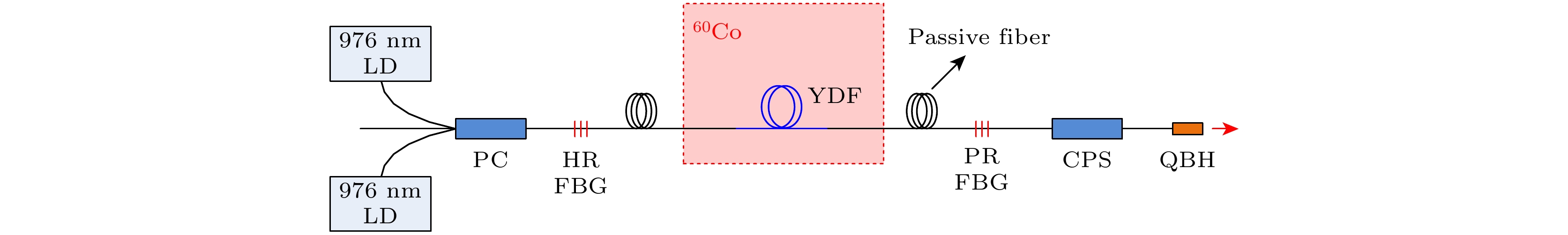 图 1 掺镱光纤激光器辐照、光漂白实验光路结构图(LD, 半导体激光器; PC, 泵浦合束器; HR FBG, 高反光纤光栅; PR FBG, 部分反射光纤光栅; YDF, 掺镱光纤; CPS, 泵浦剥除器; QBH, 防反射输出接头)