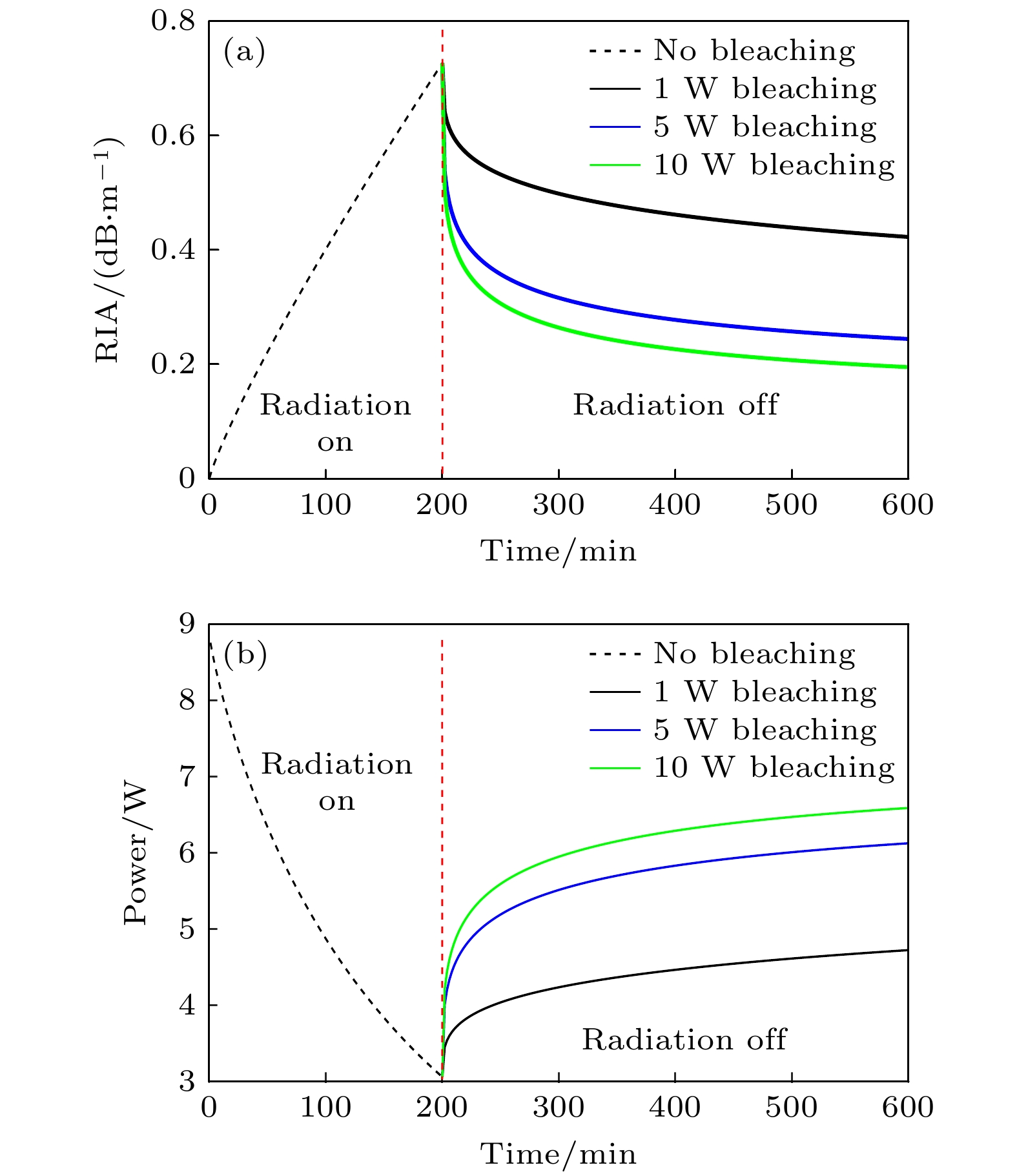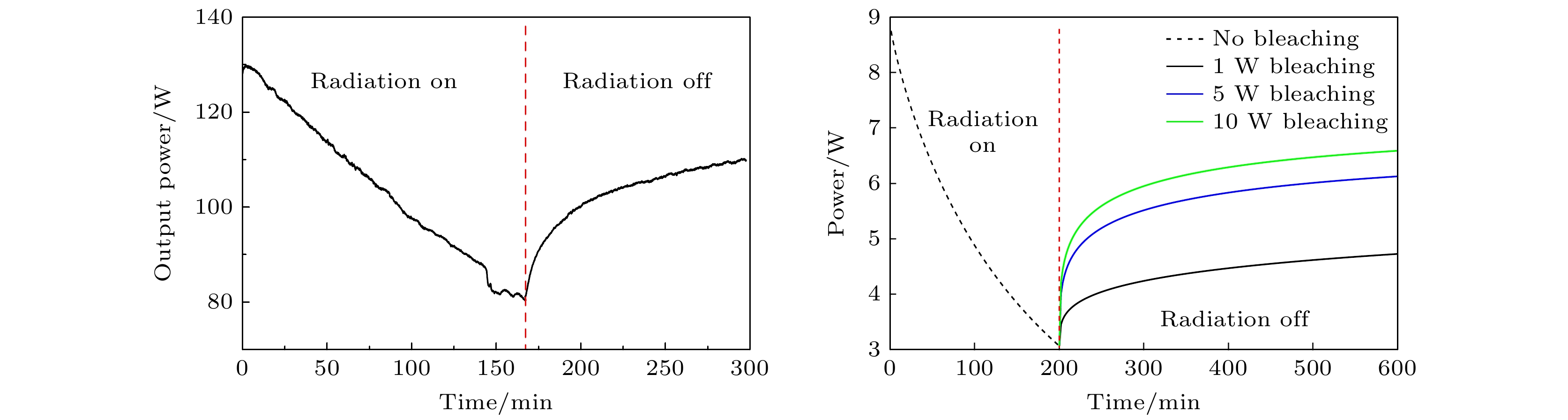 In radiation environments, the radiation induced attenuation (RIA) of the active optical fiber can lead to a significant decline in the performance of fiber laser system. An effective way to solve this problem is to bleach the active fiber using pumps at certain wavelengths, namely photo-bleaching. Experiments have shown that output power of irradiated Yb-doped fiber laser experiences remarkable recovery under 976-nm pump. However, under 976-nm pump, signals at both 976 nm and 1070 nm co-exist in Yb-doped fiber. Moreover, it is difficult to distinguish which wavelength is responsible for the photo-bleaching process. Herein, a one-hundred-watt level Yb-doped fiber laser is irradiated with gamma-ray radiation. In the radiation process, a significant output decline from 129 W at 0 Gy to 81 W at 100 Gy is observed. Then, self-bleaching test is conducted with 976-nm pump. After 2-h bleaching, the output power is restored to 111 W, corresponding to a recovery ratio of about 37.0%. To verify the specific wavelength responsible for the performance recovery, photo-bleaching characteristics of Yb-doped fiber lasers are investigated under different pump wavelengths including 915, 976, 1070 and 1550 nm. Experiments show that laser signal at 1 μm waveband is the primary cause for the bleaching of Yb-doped fibers, while, the pump at 915, 976 and 1550 nm can hardly bleach the irradiated Yb-doped fiber. The RIA recovery curves of Yb-doped fibers are measured under different 1070-nm bleaching powers. And, related evolution parameters are obtained through curve fitting. With these parameters, the RIA evolution of the Yb-doped fiber and the corresponding output power evolution of the Yb-doped fiber laser in the radiation and bleaching process are simulated. Comparisons show that the numerical results are consistent with the measurements qualitatively, demonstrating the reliability of the model. This work has guiding significance for predicting the performance of fiber laser systems in radiation and bleaching environments.