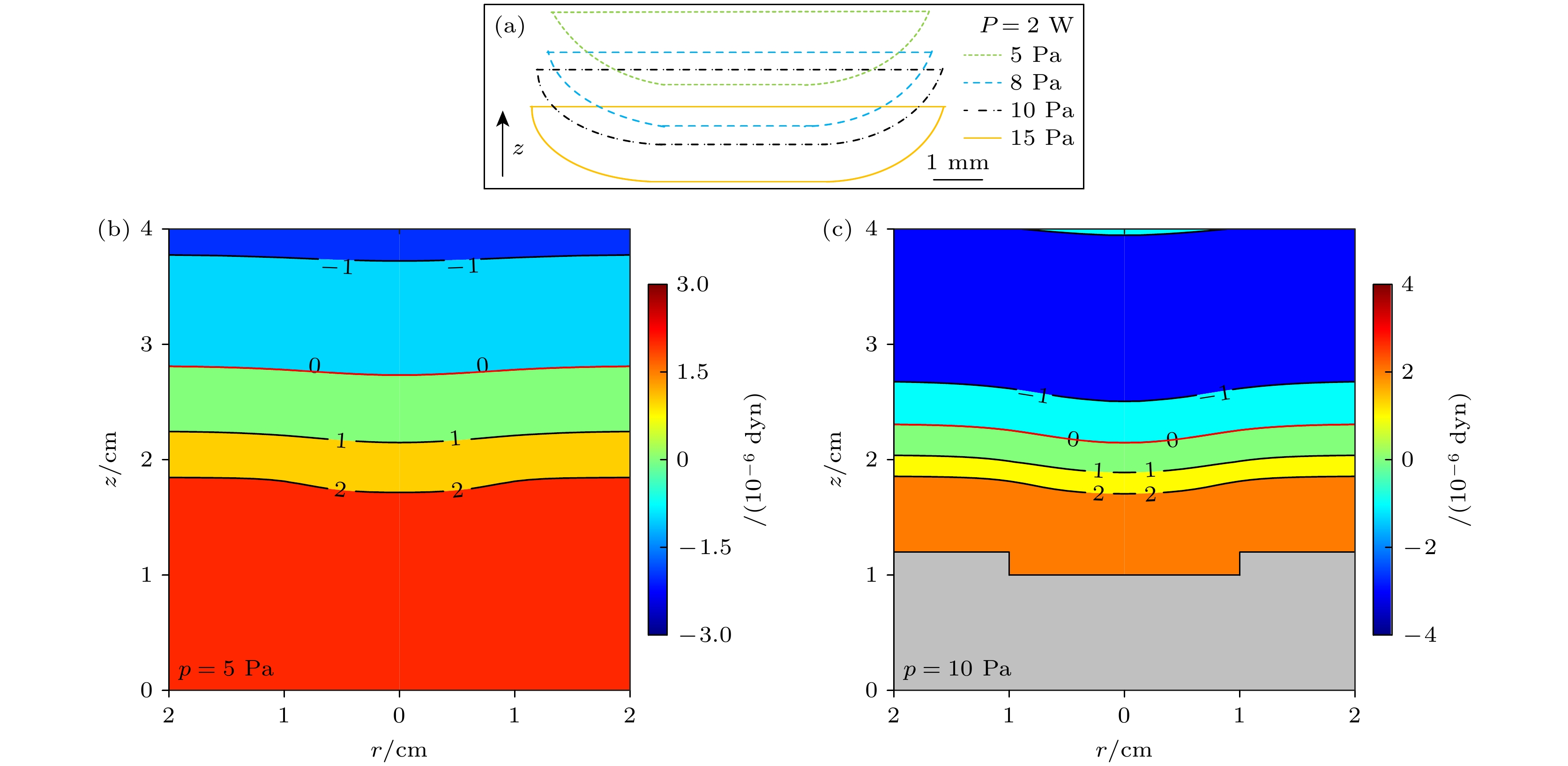 图 3 (a) 功率2 W, 气压由5 Pa增至15 Pa时, 侧面观察尘埃颗粒空间分布轮廓图; (b), (c) 射频电压50 V (对应射频功率2 W), 气压分别为5 Pa和10 Pa时, 模拟得到的尘埃颗粒所受轴向合力图(考虑重力、电场力以及离子拖拽力), 图中粗红线代表尘埃颗粒轴向合力为0的位置. 凹槽直径${\boldsymbol{\phi}} $ = 20 mm