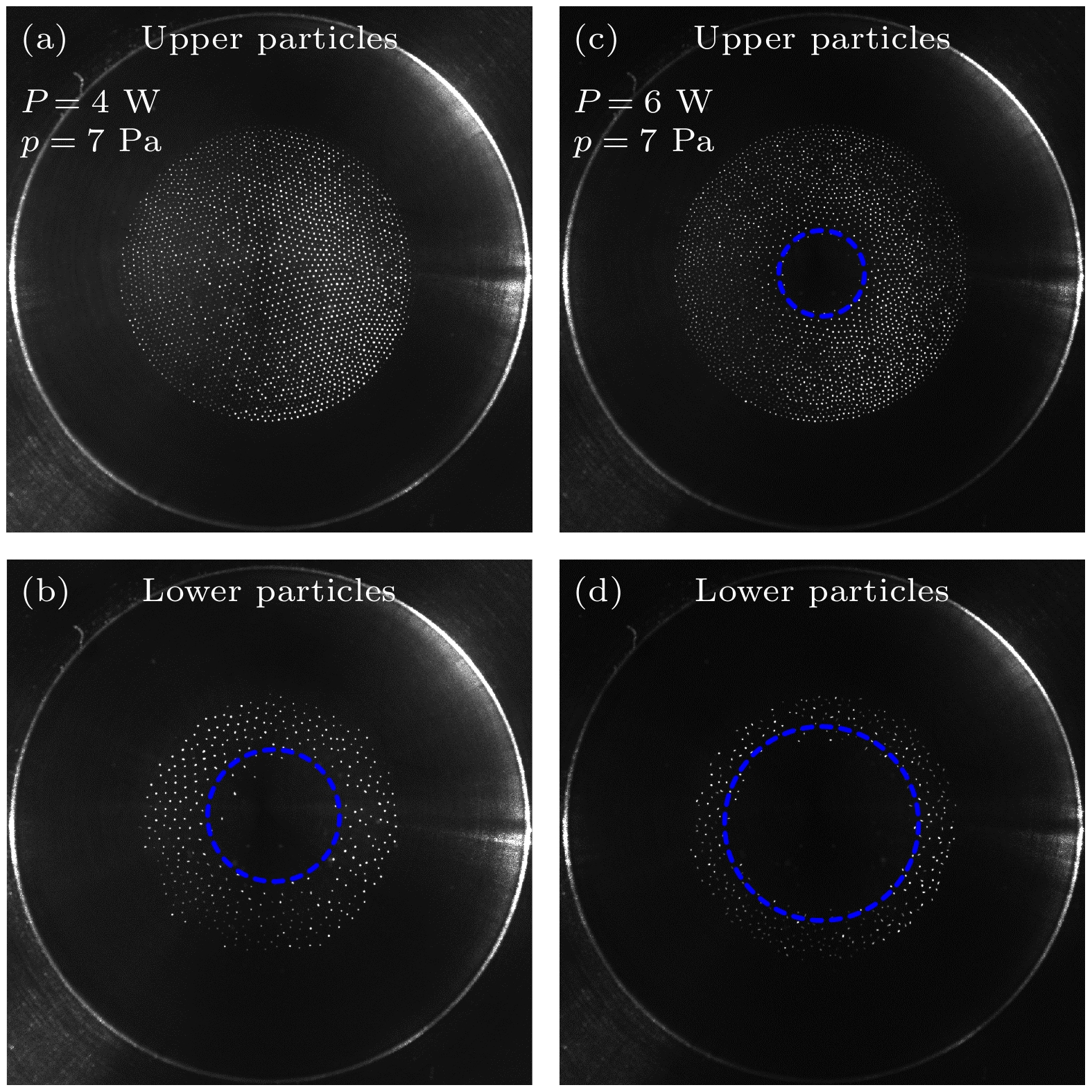 Figure 4. Void formations in the uppermost and lowermost dust particle layers are experimentally observed via a high-resolution camera under RF powers of 4 W and 6 W, at 7 Pa. The groove diameter is ${\boldsymbol{\phi}} $ = 40 mm.