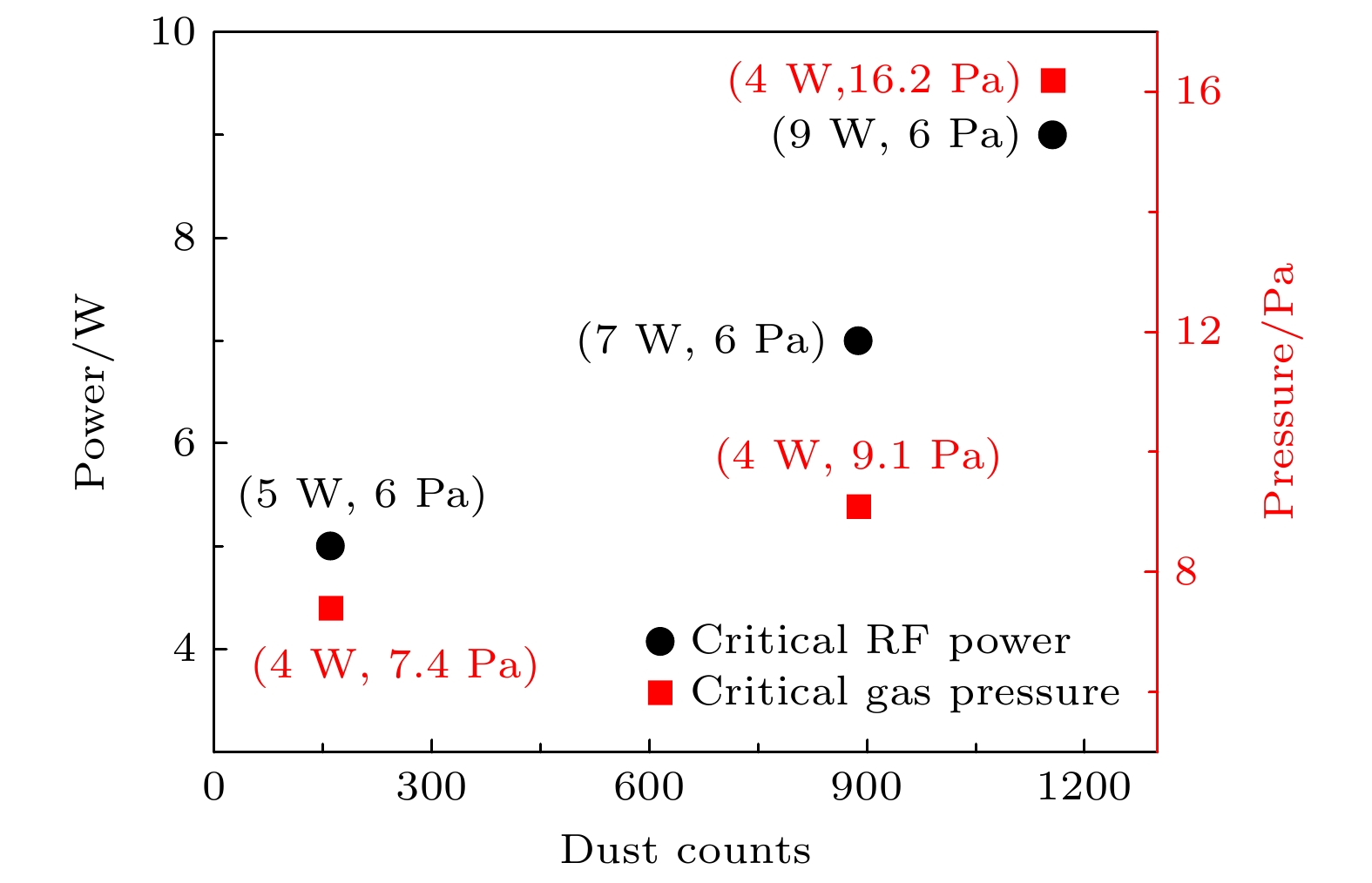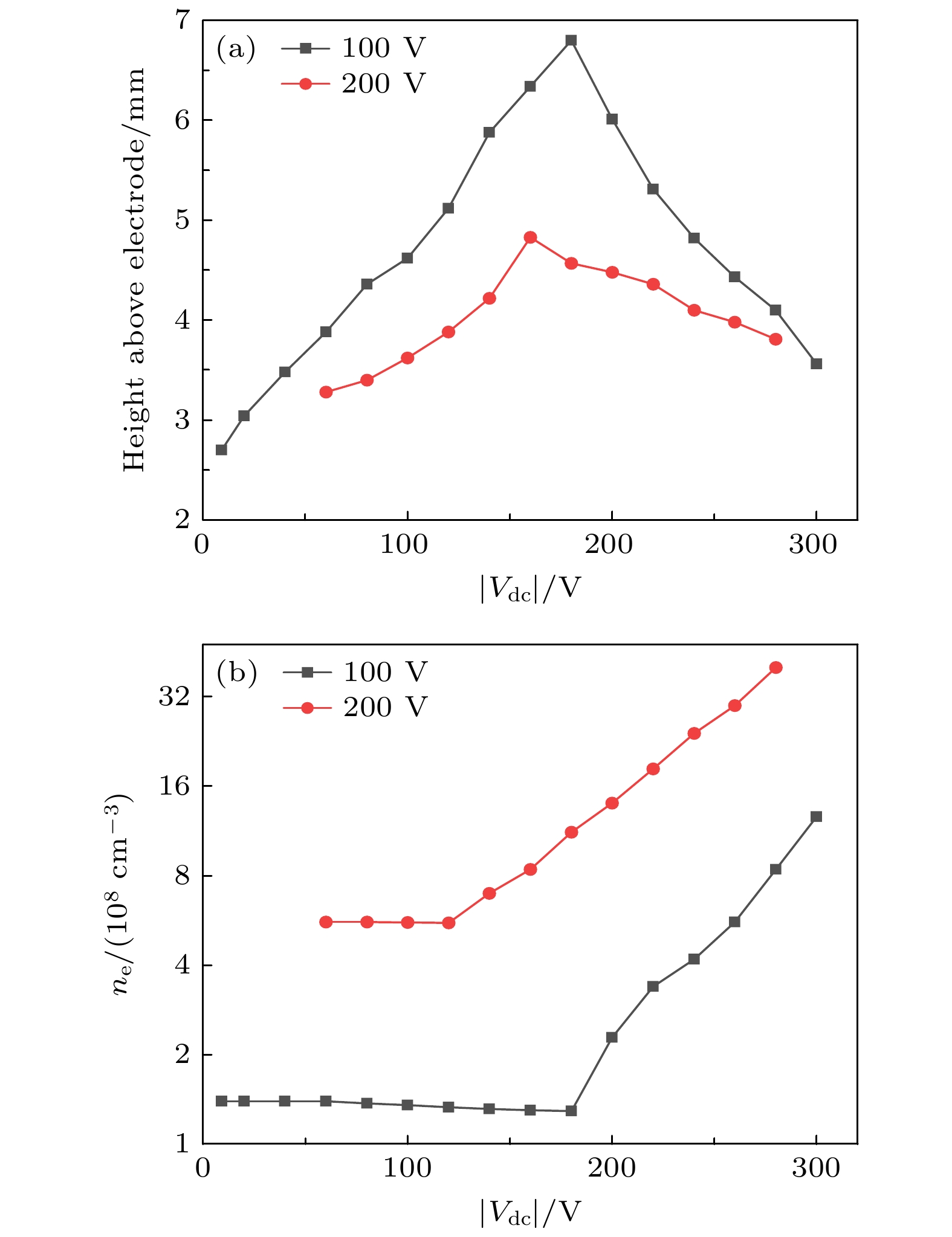 Figure 8. (a) Height of dust particles above the lower electrodeand (b) the electron density at the chamber center as a functions of the DC $ \left| {{V_{{\text{dc}}}}} \right| $ under 100 V and 200 V, at fixed 60 Pa.