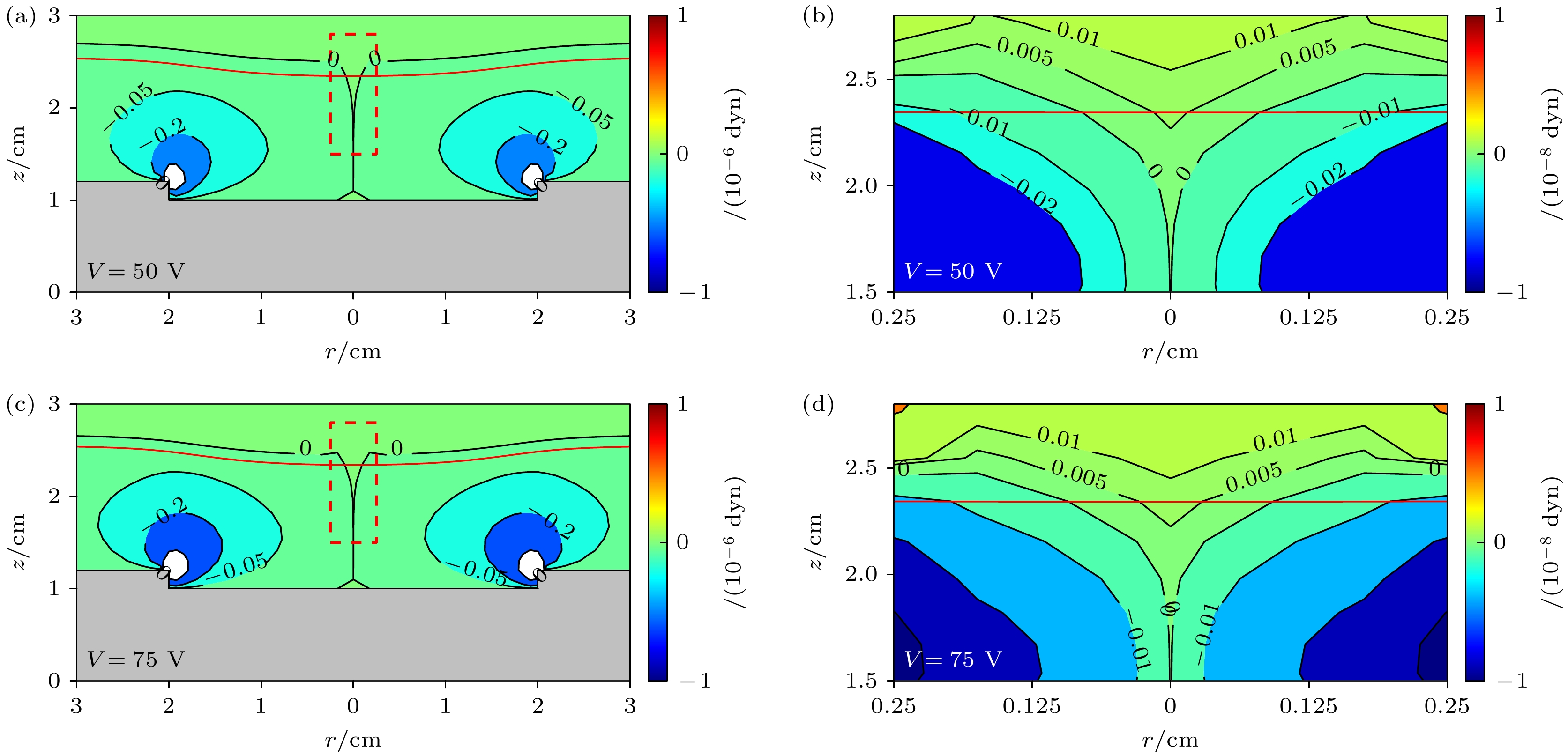 图 6 气压7 Pa, 射频电压分别为(a) 50 V和(c) 75 V(对应实验射频功率4 W和6 W)时, 采用流体模拟得到的尘埃颗粒径向合力图; (b), (d)分别对应为(a), (c)红虚线区域内放大后的局部图. 凹槽直径${\boldsymbol{\phi}} $ = 40 mm