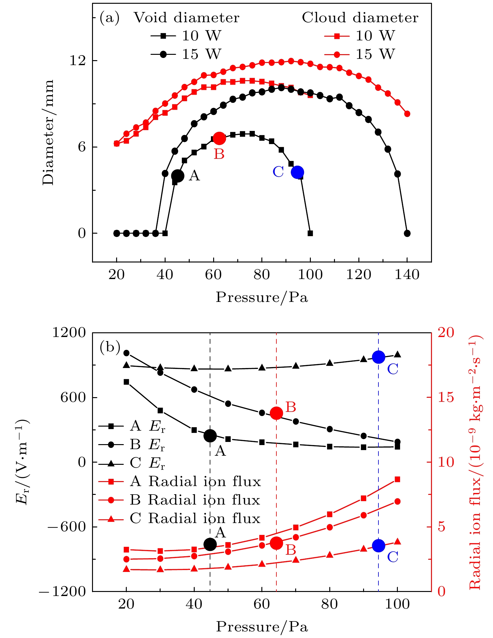 Figure 7. (a) Variations in void diameter and dust cloud outer diameter with pressure under 10 W and 15 W; (b) radial electric field (Er) and radial ion flux at positions A, B, and C as a function of pressure. The groove diameter is ${\boldsymbol{\phi}} $ = 20 mm, the dust cloud consists of several hundred particles.