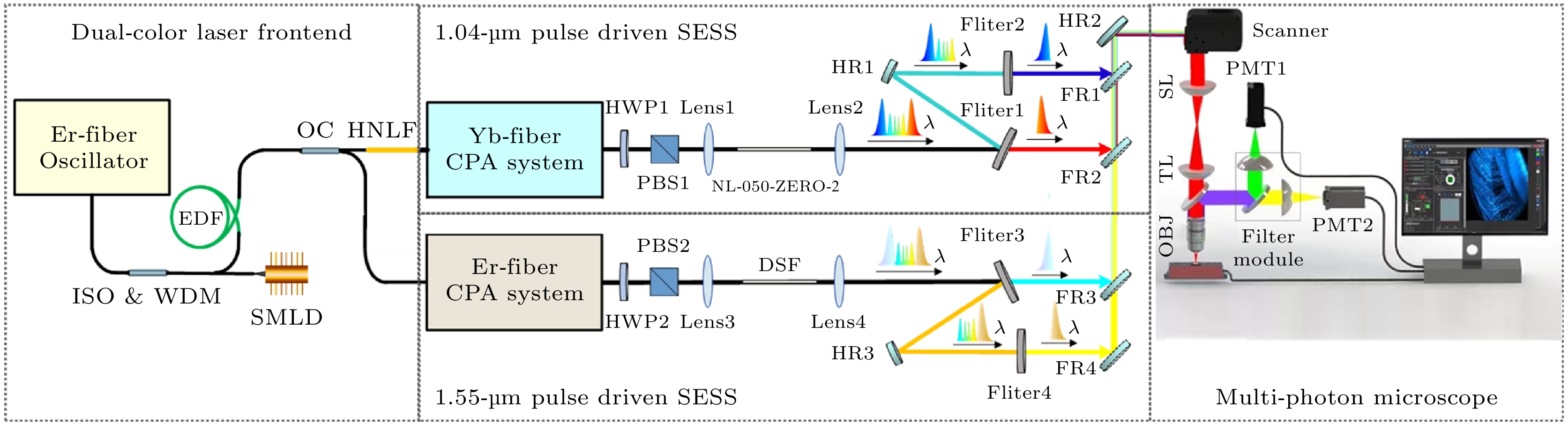 Figure 1. Schematic setup of the multi-photon microscopy driven by dual-color laser enabled SESS source. ISO, isolator; WDM, wavelength-division multiplexing; EDF, erbium-doped fiber; SMLD, semiconductor laser diode; OC, output coupler; HNLF, highly nonlinear fiber; CPA, chirped-pulse amplification; HWP, half-wave plate; PBS, polarization beam splitter; HR, high reflectance mirror; SL, scan lens; TL, tube lens; OBJ, objective lens; PMT, photomultiplier tube.