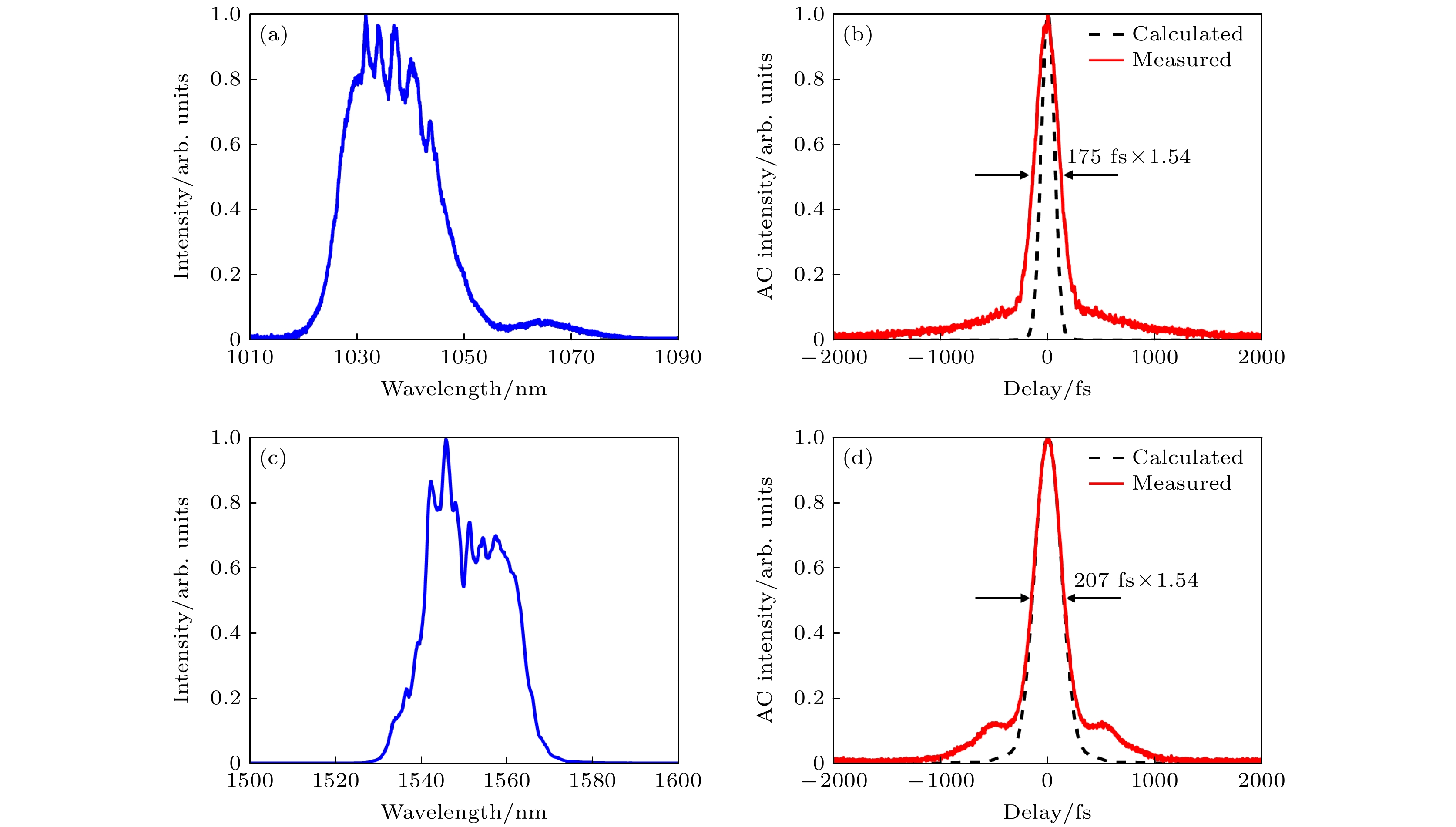 图 2 双波长激光放大后的光谱和自相关轨迹 (a) 1040 nm分支的输出光谱; (b) 测量的自相关曲线(红色)和计算的自相关曲线, 对应由1040 nm输出光谱(黑色)计算出的变换极限脉冲; (c) 1550 nm分支的输出光谱; (d) 测量的自相关曲线(红色)和计算的自相关曲线, 对应由1550 nm输出光谱(黑色)给出的变换极限脉冲