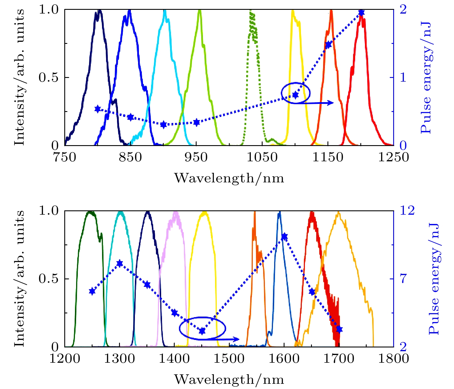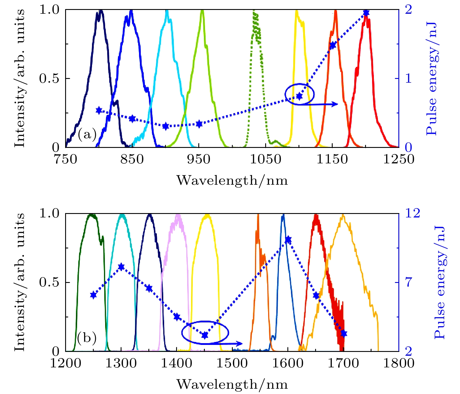 图 3 滤波得到的最左/最右的光谱波瓣和相应的脉冲能量 (a) 由4.3 cm的HNLF(NL-1050-ZERO-2)输出的滤波后光谱和相应的脉冲能量; (b) 由9.5 cm的DSF输出的滤波后光谱和相应的脉冲能量
