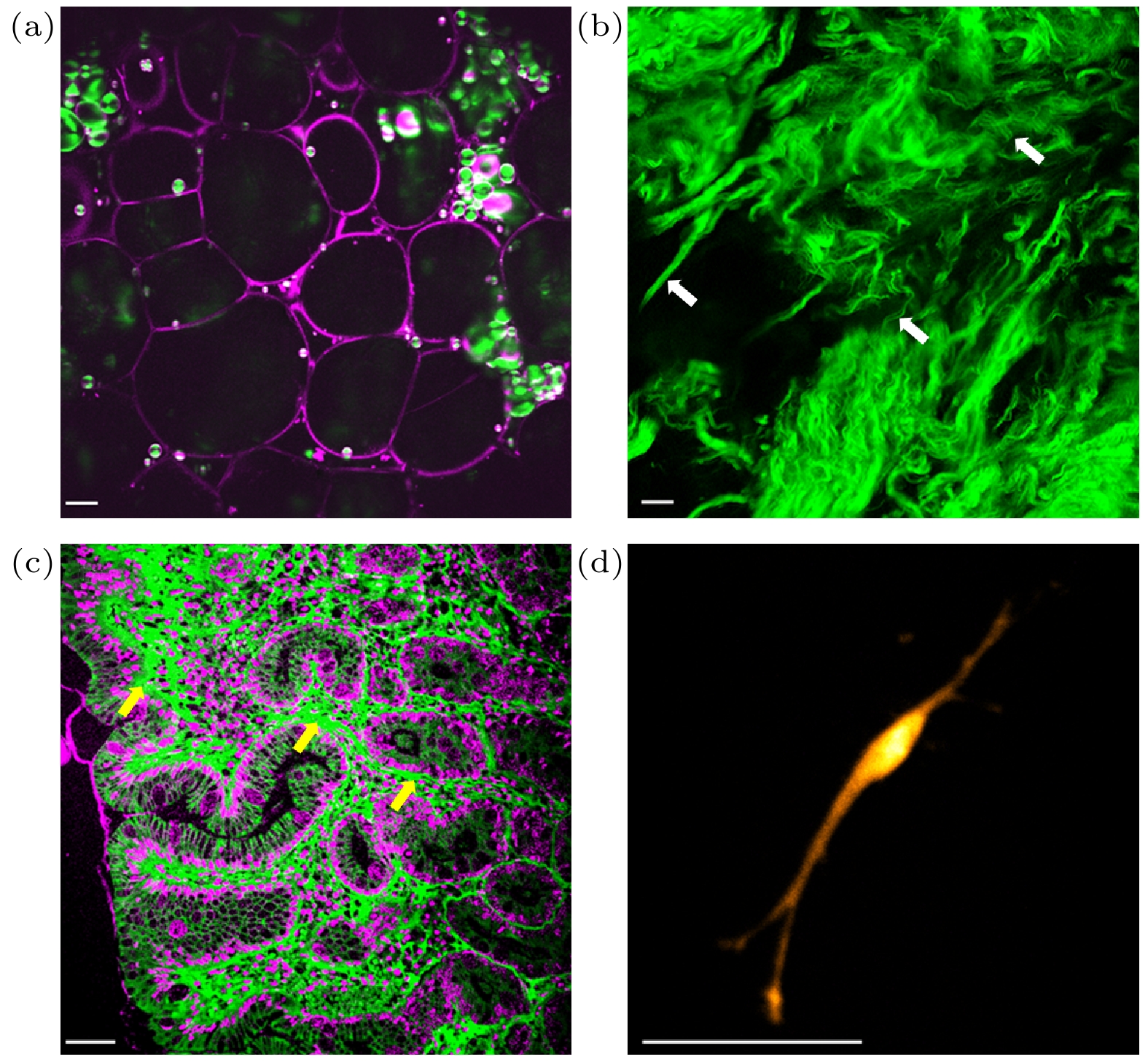 Figure 4. Harmonic generation and fluorescence imaging based on multiphoton microscope driven by dual-color laser enabled SESS source: (a) SHG/THG image of potato tuber; (b) SHG image of human gastric biopsy tissue; (c) SHG/THG image of a H&E-stained section of human gastric tissue; (d) TPEF image of a human neuron. White arrows: collagen bundles; yellow arrows: collagen fibers. Scale bar: 50 μm.