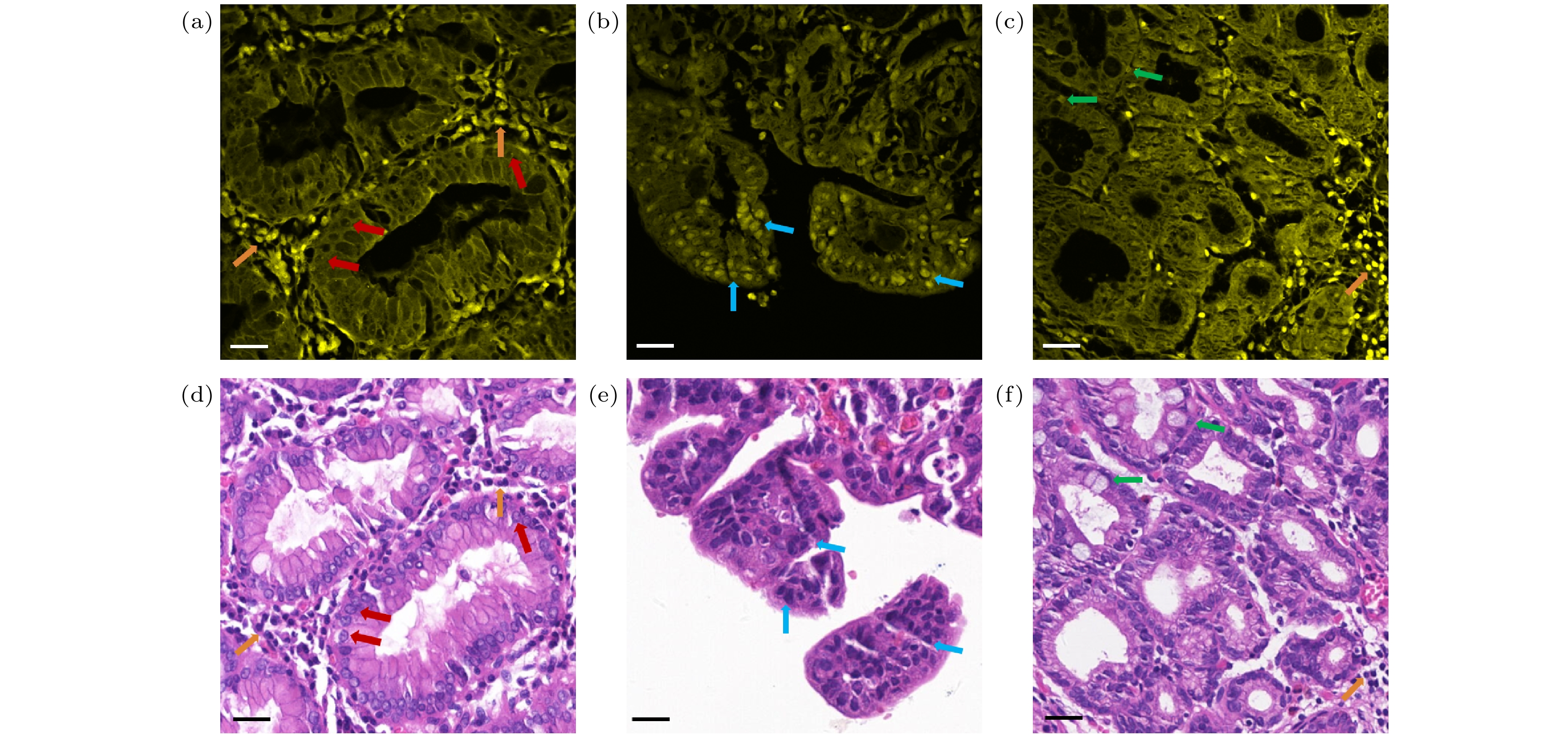 Figure 5. TPEF images and corresponding H&E-stained images of different gastric mucosa: (a) TPEF image of normal gastric mucosa; (b) TPEF image of gastric carcinoma, (c) TPEF image of atrophic gastritis; (d) H&E-stained image of normal gastric mucosa; (e) H&E-stained image of gastric carcinoma; (f) H&E-stained image of atrophic gastritis. Red arrows: normal gastric epithelial cell nuclei; orange arrows: inflammatory cells; blue arrows: cancerous gastric epithelial cell nuclei; green arrows: goblet cell nuclei. Scale bar: 30 μm.