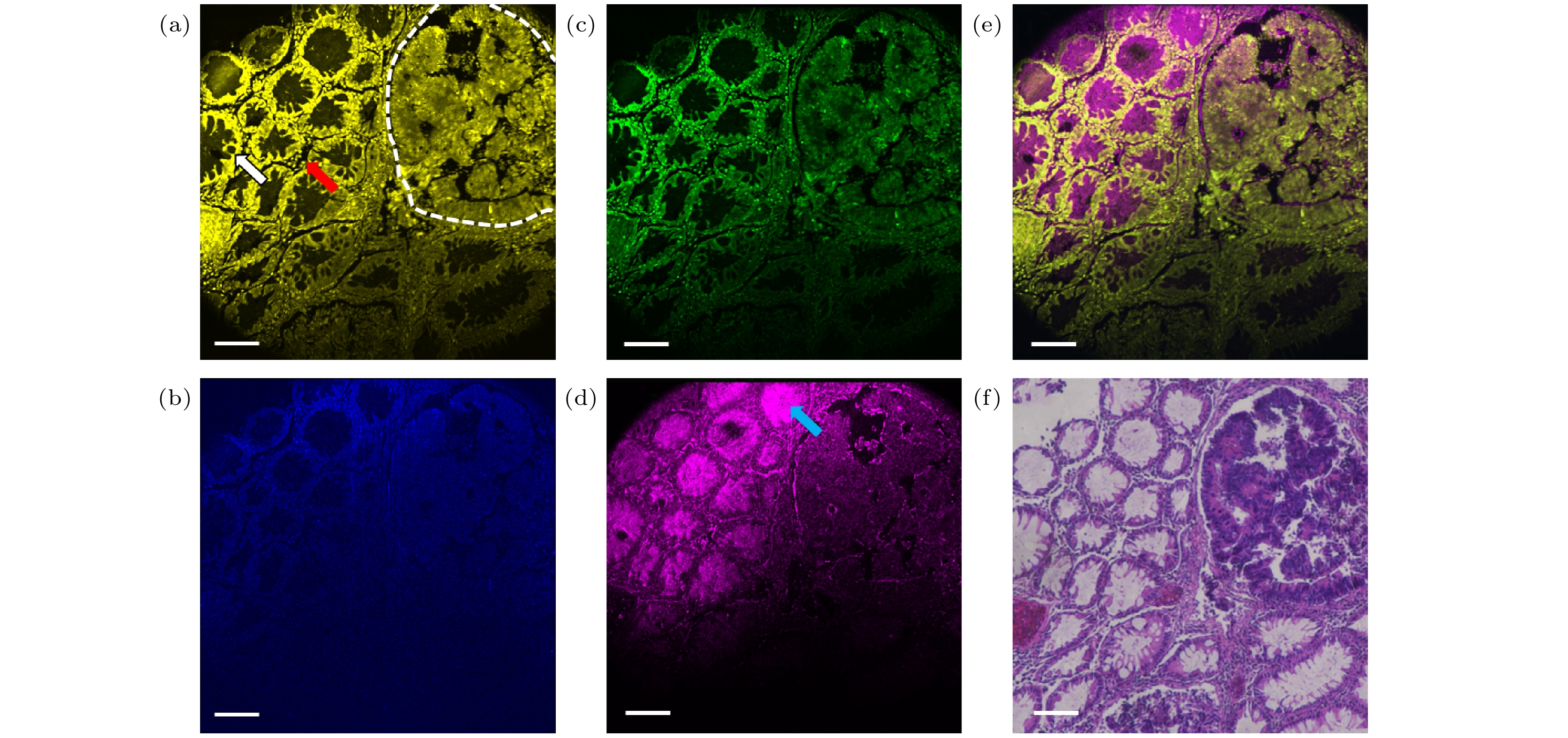 图 6 肠腺癌组织的多模态成像结果 (a) TPEF图像; (b) TrPEF图像; (c) SHG图像; (d) THG图像; (e) TPEF/SHG/TrPEF/THG叠加图像; (f) 相应的H&E图像. 白色箭头: 肠腺; 红色箭头: 炎症细胞; 蓝色箭头: 杯状细胞分泌的黏液; 白色虚线: 癌变区域. 比例尺: 100 μm