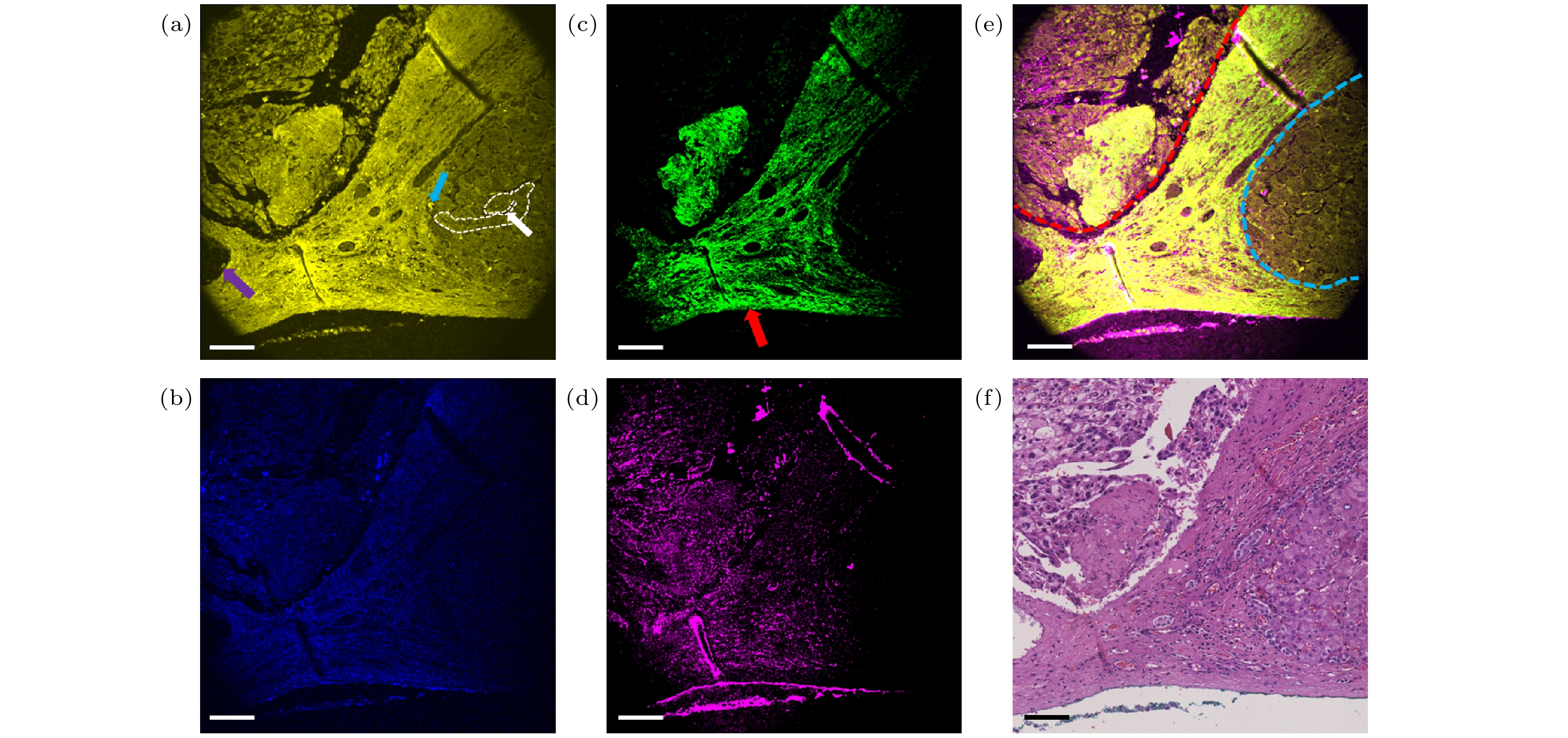 图 7 肝细胞癌组织的多模态成像结果 (a) TPEF图像; (b) TrPEF图像; (c) SHG图像; (d) THG图像; (e) TPEF/SHG/TrPEF/THG叠加图像; (f) 相应的H&E图像. 白色箭头: 肝血窦; 蓝色箭头: 巨噬细胞; 紫色箭头: 小叶间静脉; 红色箭头: 结缔组织; 白色虚线: 肝索; 蓝色虚线: 正常肝小叶; 红色虚线: 癌变区域. 比例尺: 100 μm