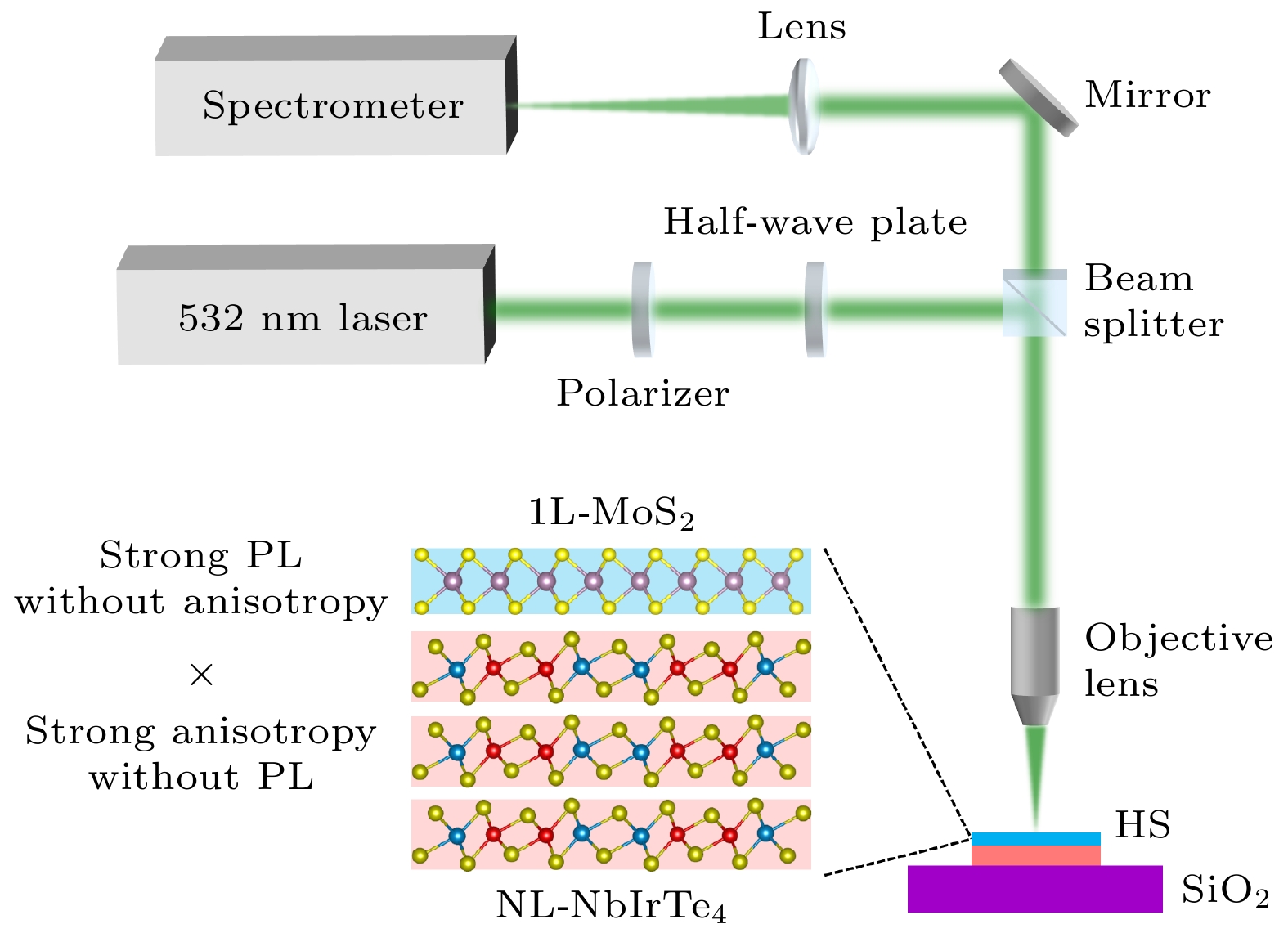 图 1 实验装置示意图. 其激发光源为波长532 nm的线偏振激光, 通过旋转半波片调节激发光偏振方向, 实现角偏振PL测量. 激光束经100倍物镜聚焦于样品表面, 激发功率控制在0.1 mW以下, 以有效抑制光致加热效应. 插图为1L-MoS2与NbIrTe4薄片堆叠的异质结侧视图