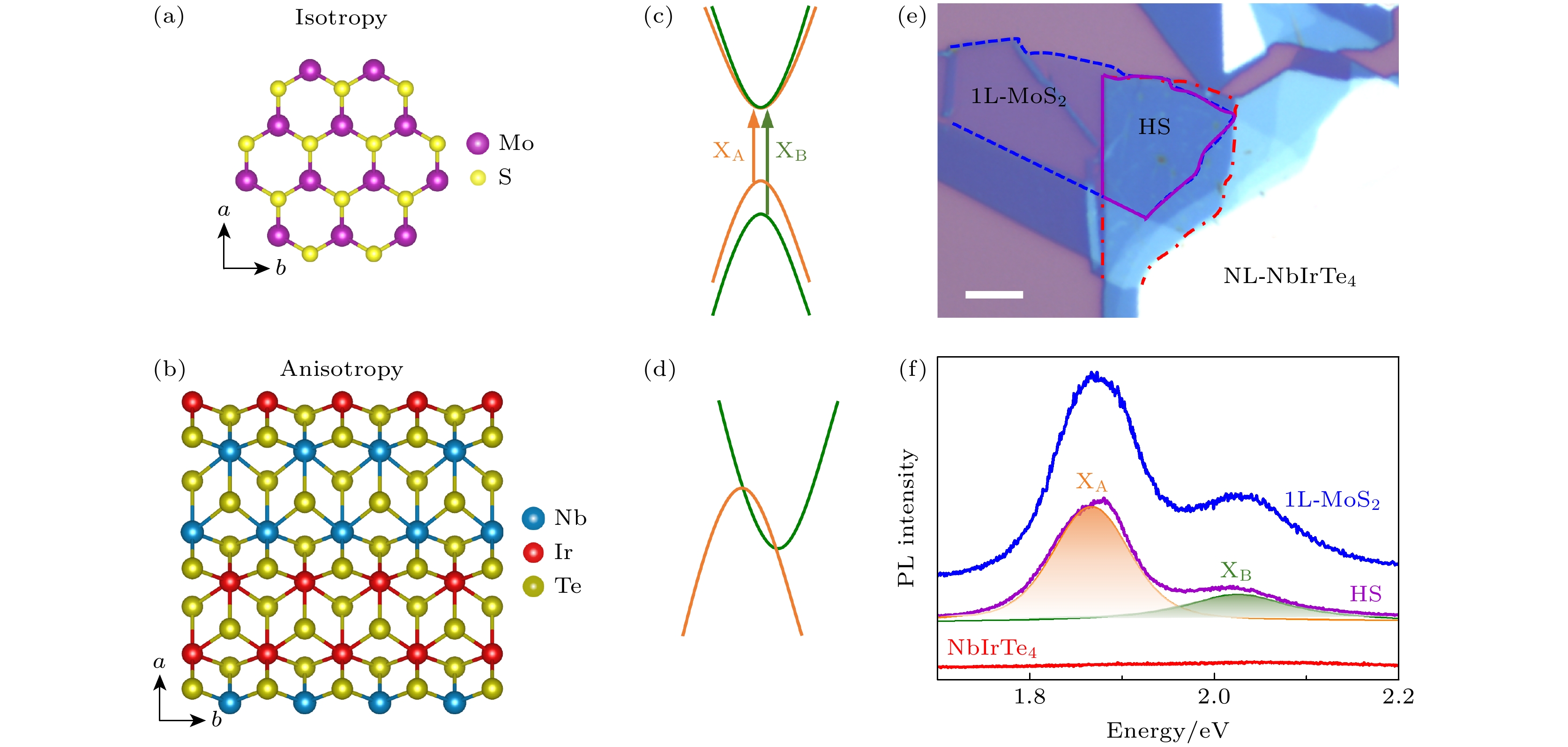 Figure 2. Structural and optical characterization of the samples: (a), (b) Crystal structures of MoS2 and NbIrTe4, respectively. (c), (d) Schematic band structures of monolayer MoS2 and the type-II Weyl semimetal NbIrTe4, highlighting their representative electronic features. (e) Optical image of the 1L-MoS2/NbIrTe4 heterostructure (HS). 1L-MoS2 and NbIrTe4 flakes are prepared separately via mechanical exfoliation. A dry-transfer technique is then used to sequentially transfer NbIrTe4 and 1L-MoS2 onto a Si/SiO2 substrate, forming a stacked 1L-MoS2/NbIrTe4 HS. The HS sample is subsequently annealed in a vacuum environment at 120 ℃ for 6 h to enhance interfacial contact and structural stability. The white dashed outline indicates the region of monolayer MoS2, the red dotted outline marks the NbIrTe4 region, and the purple solid line outline indicates the region of heterostructure. Scale bar: 5 μm. (f) PL spectra of monolayer MoS2, the 1L-MoS2/NbIrTe4 heterostructure and NbIrTe4. The orange and green shaded areas correspond to the exciton XA and XB, respectively.