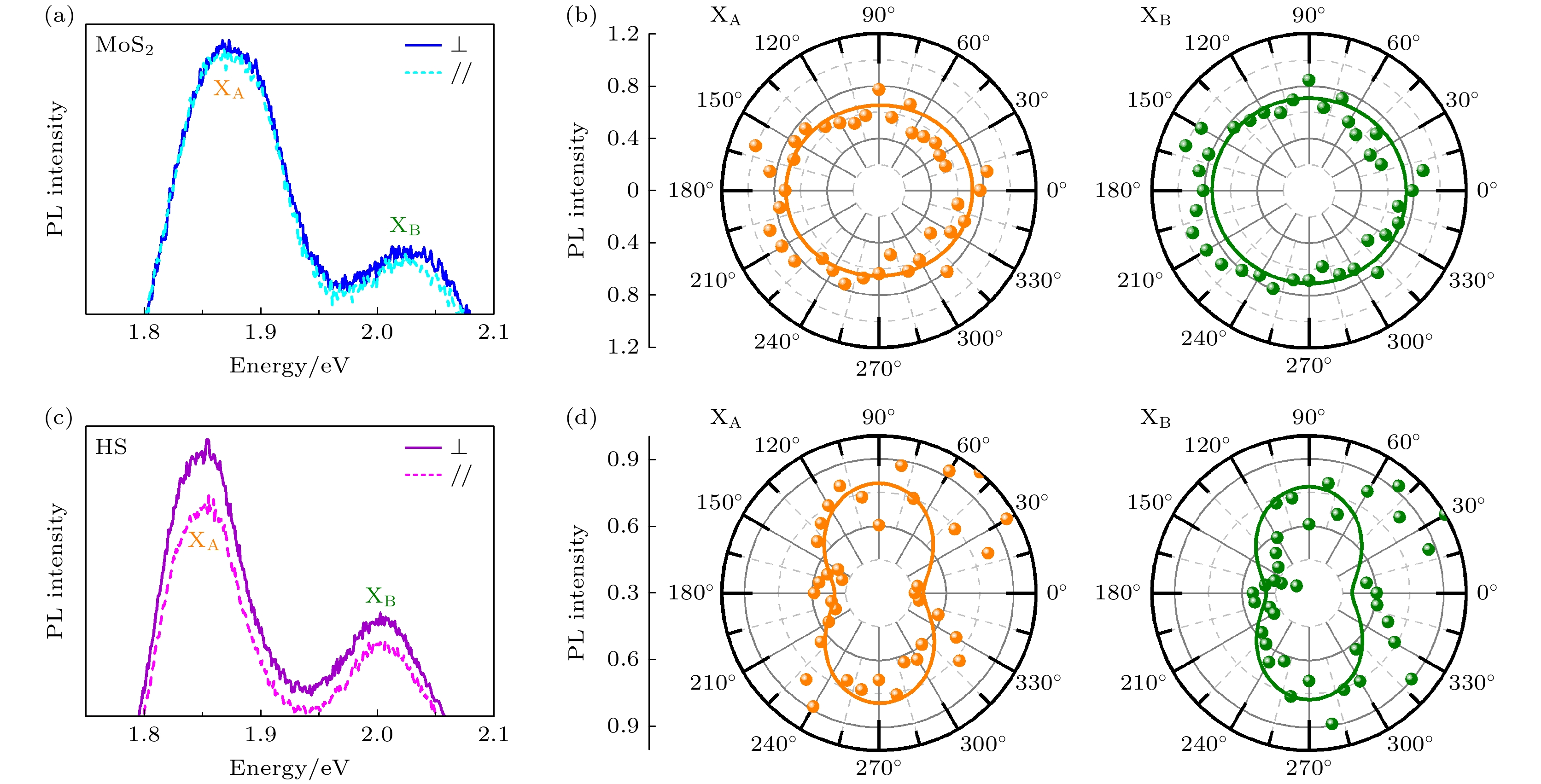 图 3 1L-MoS2与1L-MoS2/NbIrTe4异质结的角偏振PL光谱特性 (a) 1L-MoS2在线性激发光平行(0°)和垂直(90°)于b轴时的PL光谱; (b) 1L-MoS2中激子峰XA(橙色)与XB(绿色)的PL强度随偏振角变化的极坐标图, 圆点为实验测量值, 实线为拟合曲线; (c) 1L-MoS2/NbIrTe4异质结在激发光偏振方向平行(0°)和垂直于(270°)b轴时的PL光谱; (d) 异质结中激子峰XA与XB的PL强度角度依赖关系, 对应的极坐标图展示了其光学各向异性行为