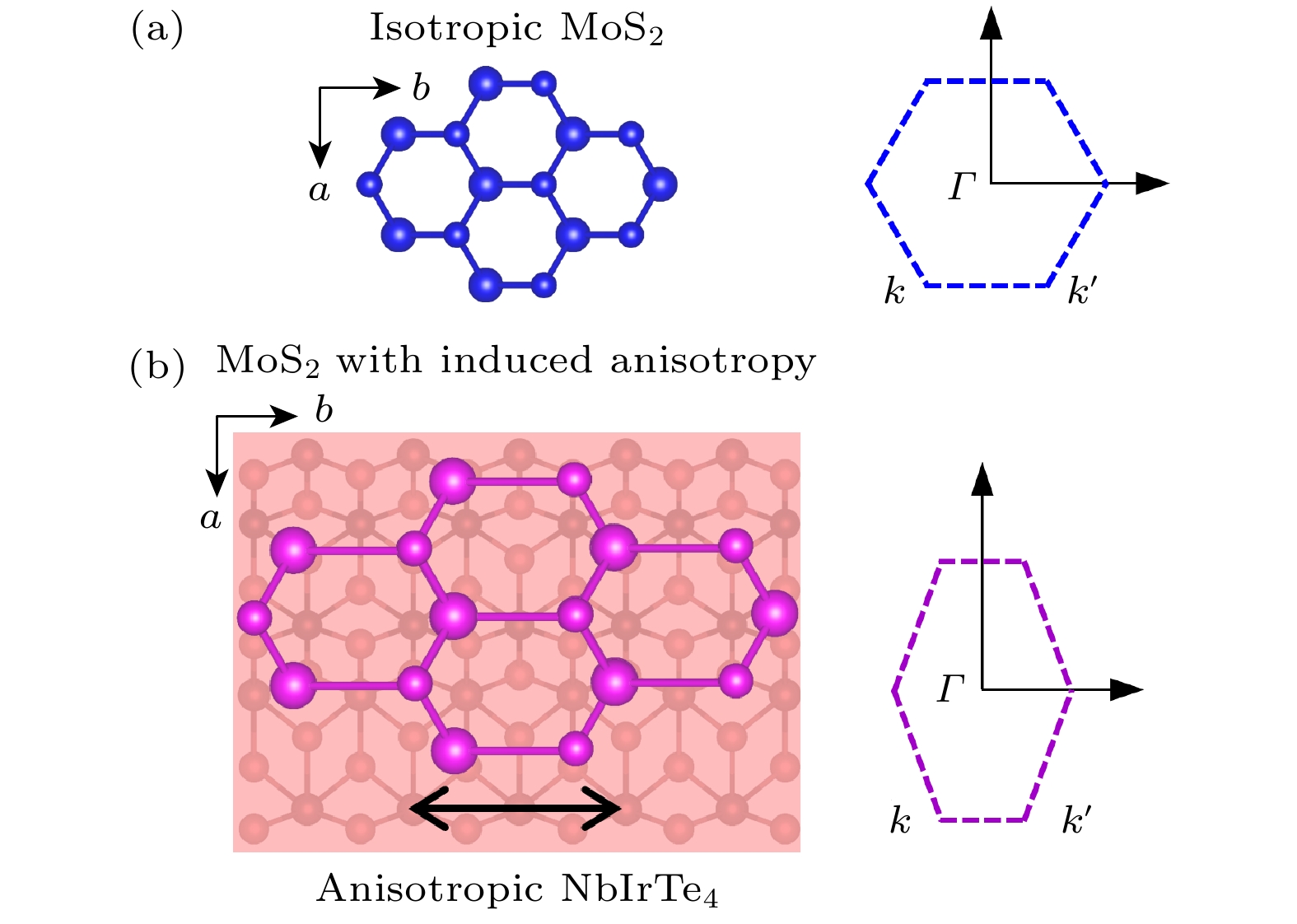 Figure 4. (a) In-plane lattice of monolayer MoS2 and corresponding Brillouin zone projected from in-plane lattice of monolayer MoS2; (b) schematic diagram of the interlayer coupling regulation mechanism of 1L-MoS2/NbIrTe4 heterostructure and corresponding Brillouin zone projected from anisotropy MoS2.