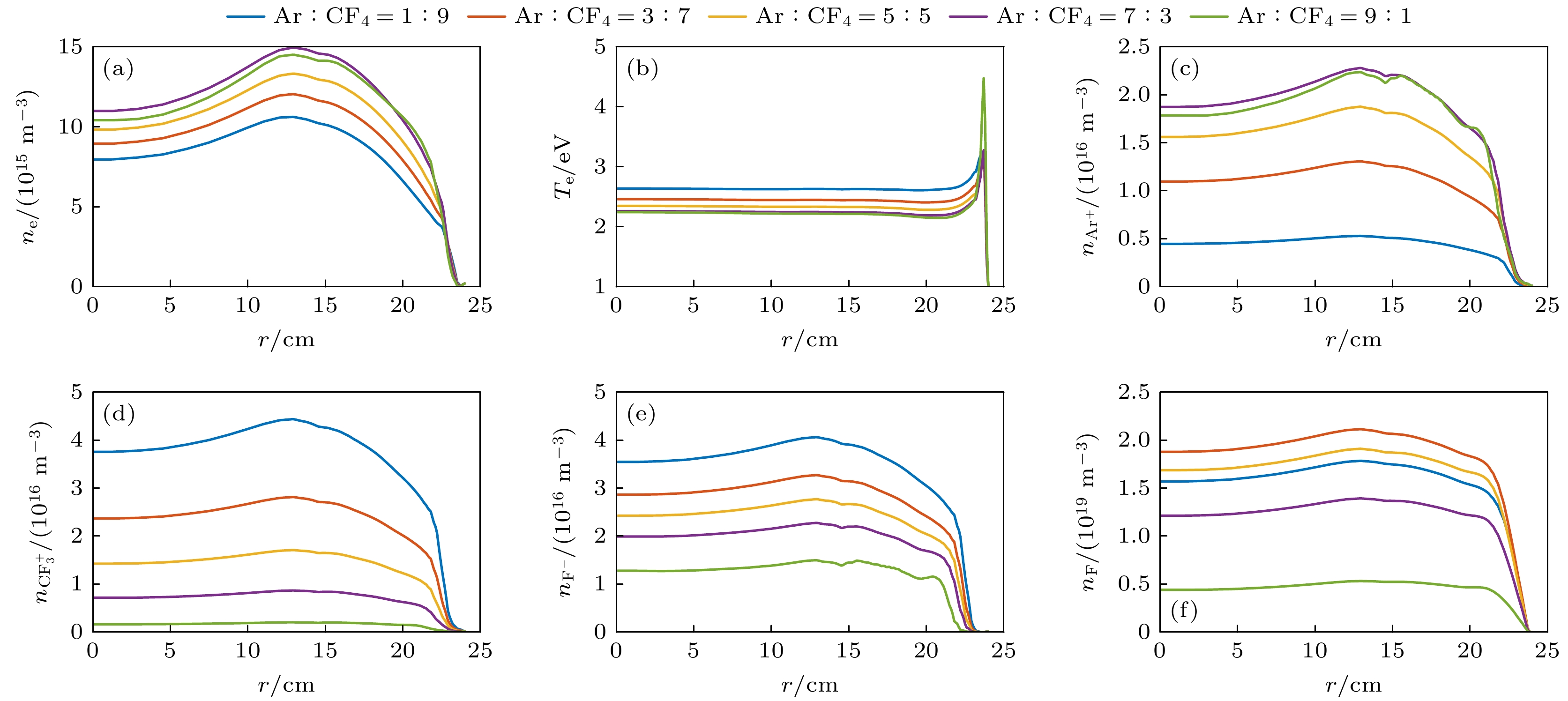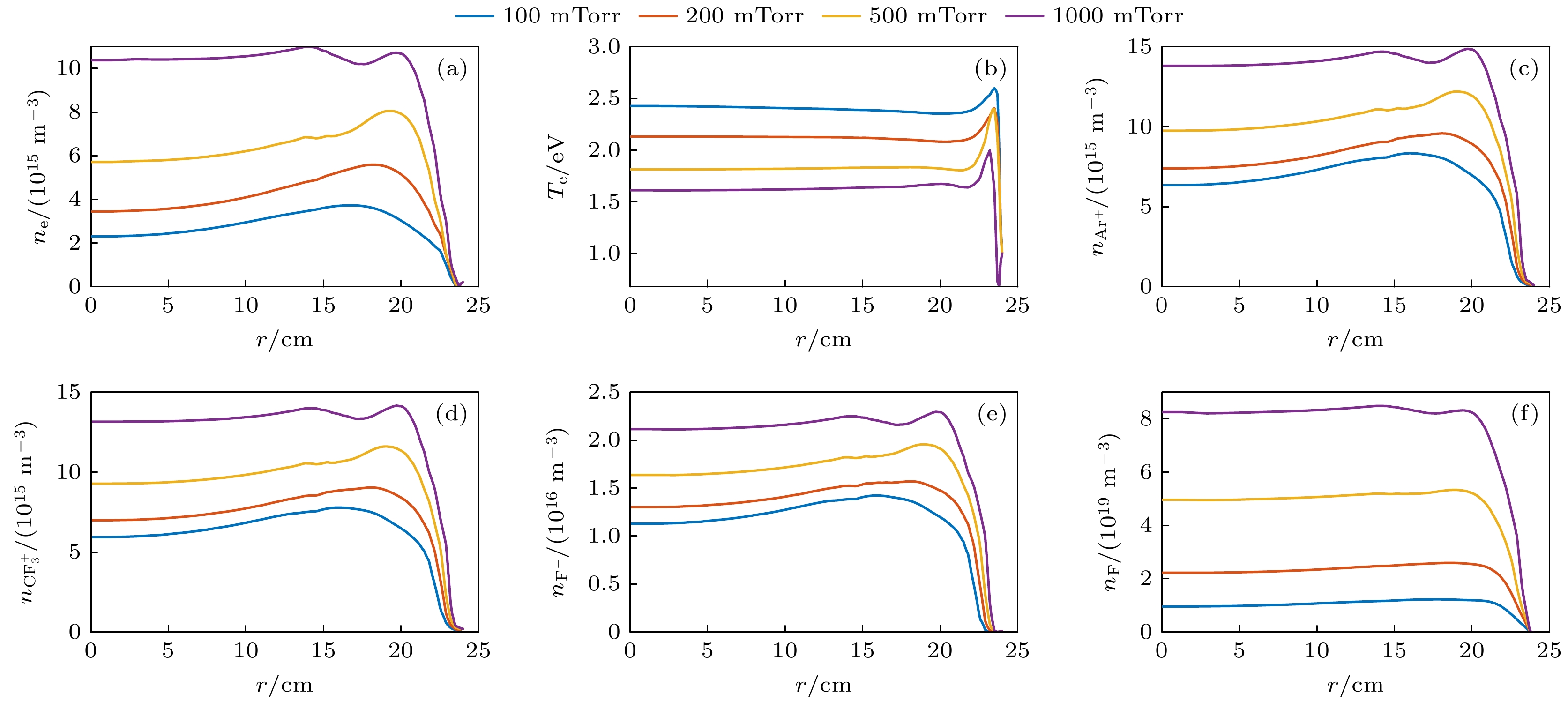 图 6 不同低频电压下(a)电子密度、(b)电子温度、(c) Ar+离子密度、(d) $\rm CF_3^+ $离子密度、(e) F–离子密度和(f) F原子密度的r方向空间分布