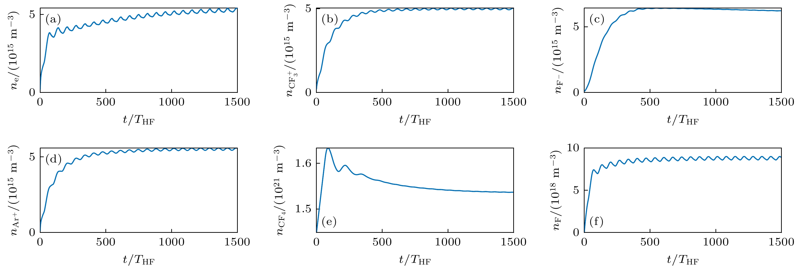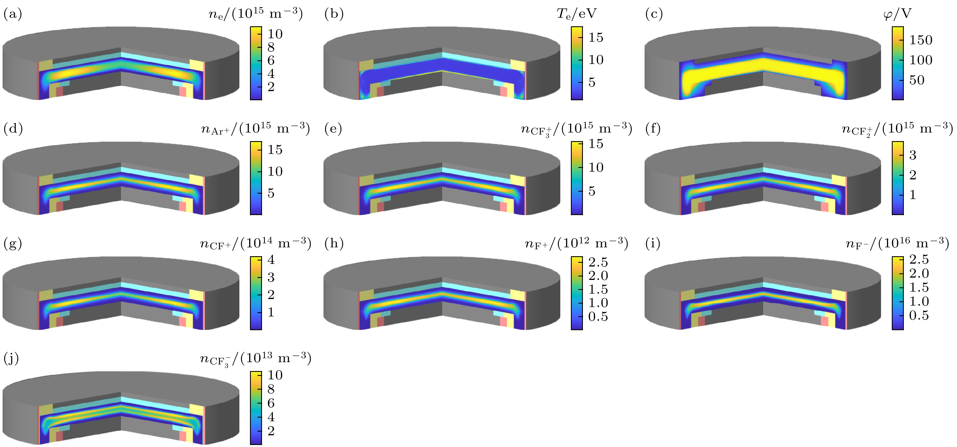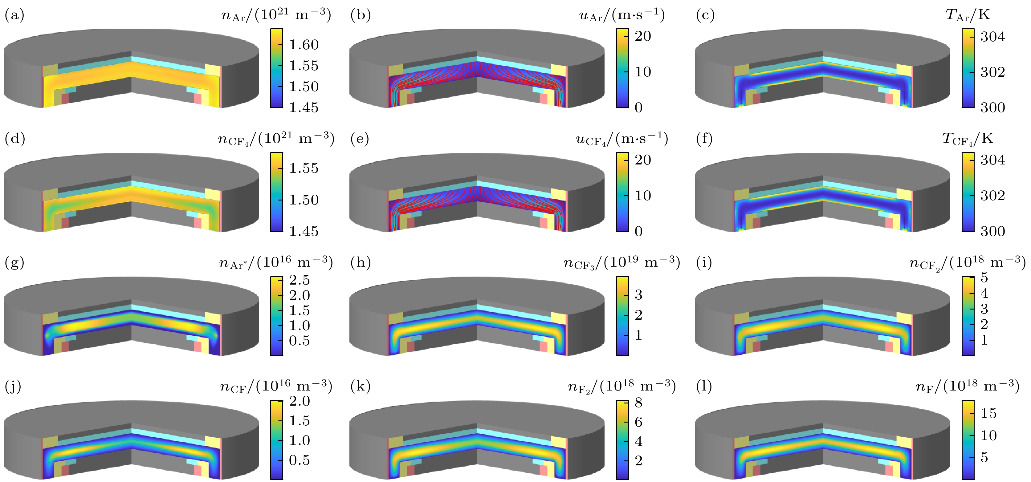 编号 反应表达式 文献 编号 反应表达式 文献 1 e + Ar → e + Ar [19] 39 e + CF4 → CF3 + F– [19] 2 Ar+ + Ar → Ar+ + Ar [19] 40 $\rm e + CF_4 \to CF_3^- + F $ [19] 3 $\rm CF_3^+ + Ar \to CF_3^+ + Ar $ [19] 41 F– + CF3 → e + CF4 [19] 4 $\rm CF_2^+ + Ar \to CF_2^+ + Ar $ [19] 42 F– + CF2 → e + CF3 [19] 5 CF+ + Ar → CF+ + Ar [19] 43 F– + CF → e + CF2 [19] 6 F+ + Ar → F+ + Ar [19] 44 F– + F → e + F2 [19] 7 F– + Ar → F– + Ar [19] 45 $\rm CF_3^- + CF_3^+ \to 2CF_3 $ [19] 8 $\rm CF_3^- + Ar \to CF_3^- + Ar $ [19] 46 $\rm F^- + CF_3^+ \to CF_3 + F $ [19] 9 Ar* + Ar → Ar* + Ar [19] 47 $\rm F^ + CF_3^+ \to CF_2 + F_2 $ [19] 10 CF3 + Ar → CF3 + Ar [19] 48 $\rm F^- + CF_2^+ \to CF_2 + F $ [19] 11 CF2 + Ar → CF2 + Ar [19] 49 $\rm F^- + CF_2^+ \to CF + F_2 $ [19] 12 CF + Ar → CF + Ar [19] 50 F– + CF+ → CF + F [19] 13 F2 + Ar → F2 + Ar [19] 51 F– + F+ → 2F [19] 14 F + Ar → F + Ar [19] 52 $\rm CF_3^- + CF_2^+ \to CF_3 + CF_2 $ [19] 15 e + CF4 → e + CF4 [19] 53 $\rm CF_3^- + CF^+ \to CF_3 + CF $ [19] 16 Ar+ + CF4 → Ar+ + CF4 [19] 54 $\rm CF_3^- + F^+ \to CF_3 + F $ [19] 17 $\rm CF_3^+ + CF_4 \to CF_3^+ + CF_4 $ [19] 55 $\rm CF_2^+ + CF_3 \to CF_3^+ + CF_2 $ [19] 18 $\rm CF_2^+ + CF_4 \to CF_2^+ + CF_4 $ [19] 56 $\rm CF^+ + CF_3 \to CF_3^+ + CF $ [19] 19 CF+ + CF4 → CF+ + CF4 [19] 57 $\rm CF^+ + CF_2 \to CF_2^+ + CF $ [19] 20 F+ + CF4 → F+ + CF4 [19] 58 F + CF3 → CF4 [19] 21 F– + CF4 → F– + CF4 [19] 59 F + CF2 → CF3 [19] 22 $\rm CF_3^- + CF_4 \to CF_3^- + CF_4 $ [19] 60 F + CF → CF2 [19] 23 Ar* + CF4 → Ar* + CF4 [19] 61 F2 + CF3 → CF4 + F [19] 24 CF3 + CF4 → CF3 + CF4 [19] 62 F2 + CF2 → CF3 + F [19] 25 CF2 + CF4 → CF2 + CF4 [19] 63 $\rm CF_3^- + F\to CF_3 + F^- $ [19] 26 CF + CF4 → CF + CF4 [19] 64 e + Ar → 2e + Ar+ [20] 27 F2 + CF4 → F2 + CF4 [19] 65 e + Ar → e + Ar* [20] 28 F + CF4 → F + CF4 [19] 66 e + Ar* → 2e + Ar+ [20] 29 Ar + Ar → Ar + Ar [19] 67 Ar* + Ar* → e + Ar + Ar+ [20] 30 CF4 + CF4 → CF4 + CF4 [19] 68 Ar* + CF2 → Ar + CF + F [21] 31 Ar + CF4 → Ar + CF4 [19] 69 Ar* + CF3 → Ar + CF2 + F [21] 32 e + CF4 → e + CF3 + F [19] 70 Ar* + CF4 → Ar + CF2 + F2 [21] 33 e + CF4 → e + CF2 + 2F [19] 71 Ar+ + CF2 → Ar + CF+ + F [21] 34 e + CF4 → e + CF + 3F [19] 72 $\rm Ar^+ + CF_3 \to Ar + CF_2^+ + F $ [21] 35 $\rm e + CF_4 \to 2e + CF_3^+ + F $ [19] 73 $\rm Ar^+ + CF_4 \to Ar + CF_3^+ + F $ [22] 36 $\rm e + CF_4 \to 2e + CF_2^+ + 2F $ [19] 74 $\rm Ar^+ + CF_3^- \to Ar + CF_3 $ [21] 37 e + CF4 → 2e + CF+ + 3F [19] 75 Ar+ + F– → Ar + F [21] 38 e + CF4 → 2e + CF3 + F+ [19] 76 $\rm CF_3^+ + Ar\to CF_3 + Ar^+ $ [21] -