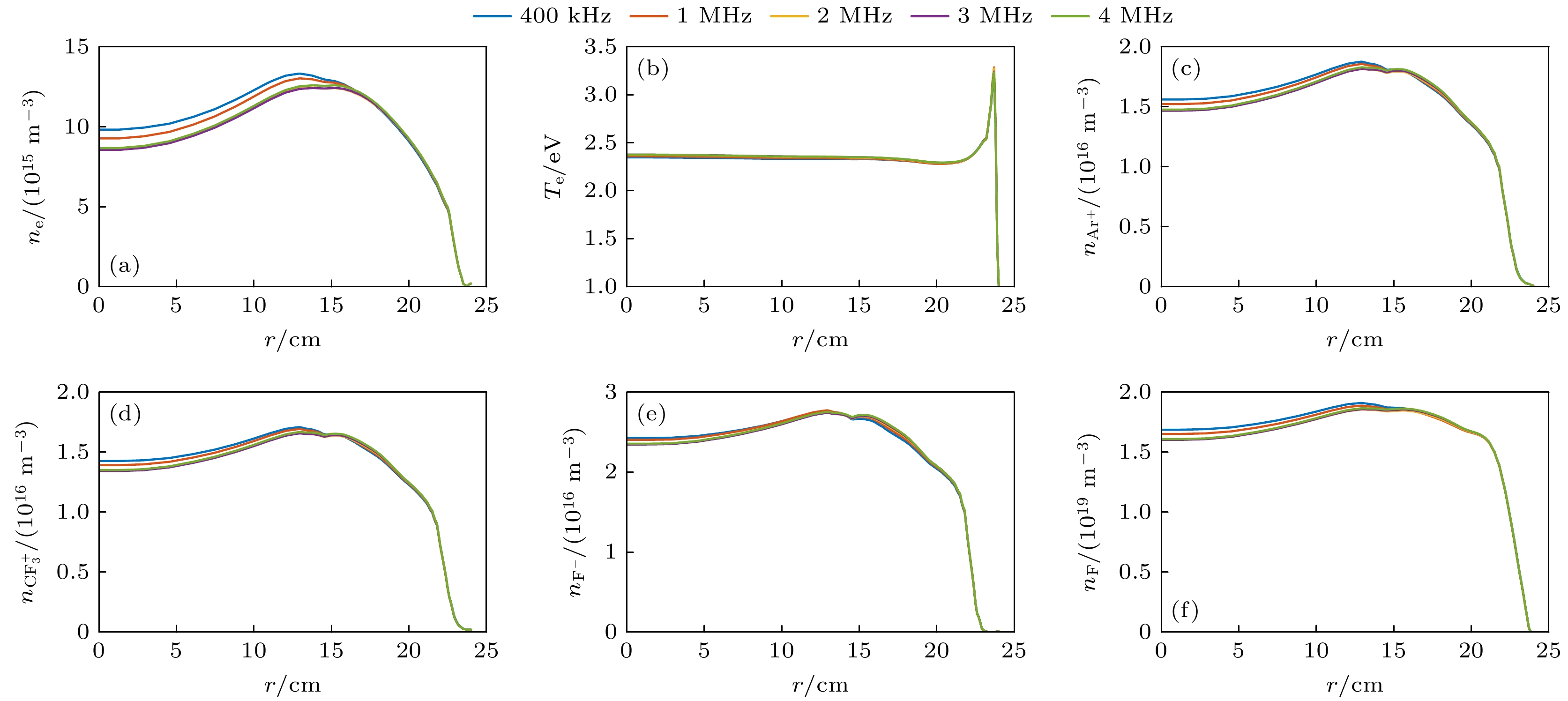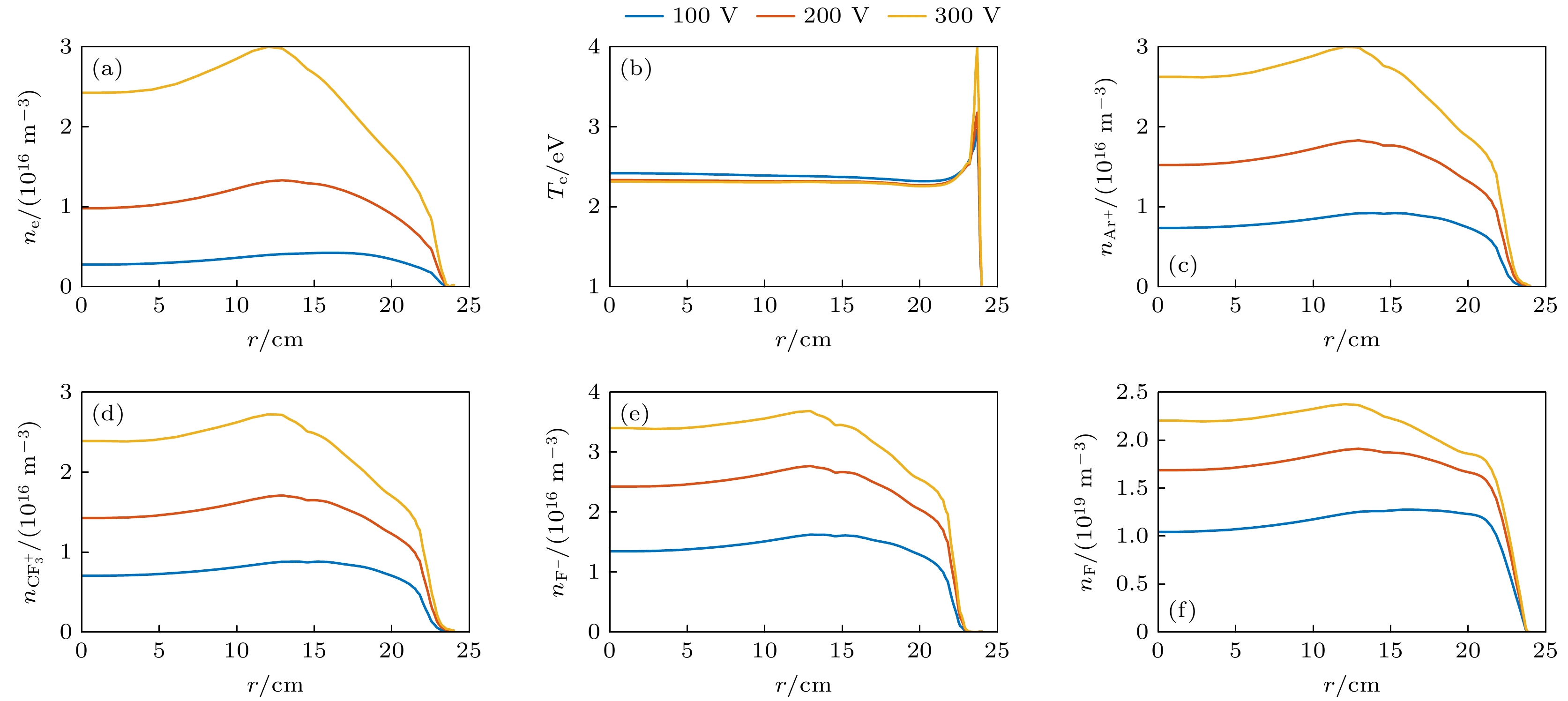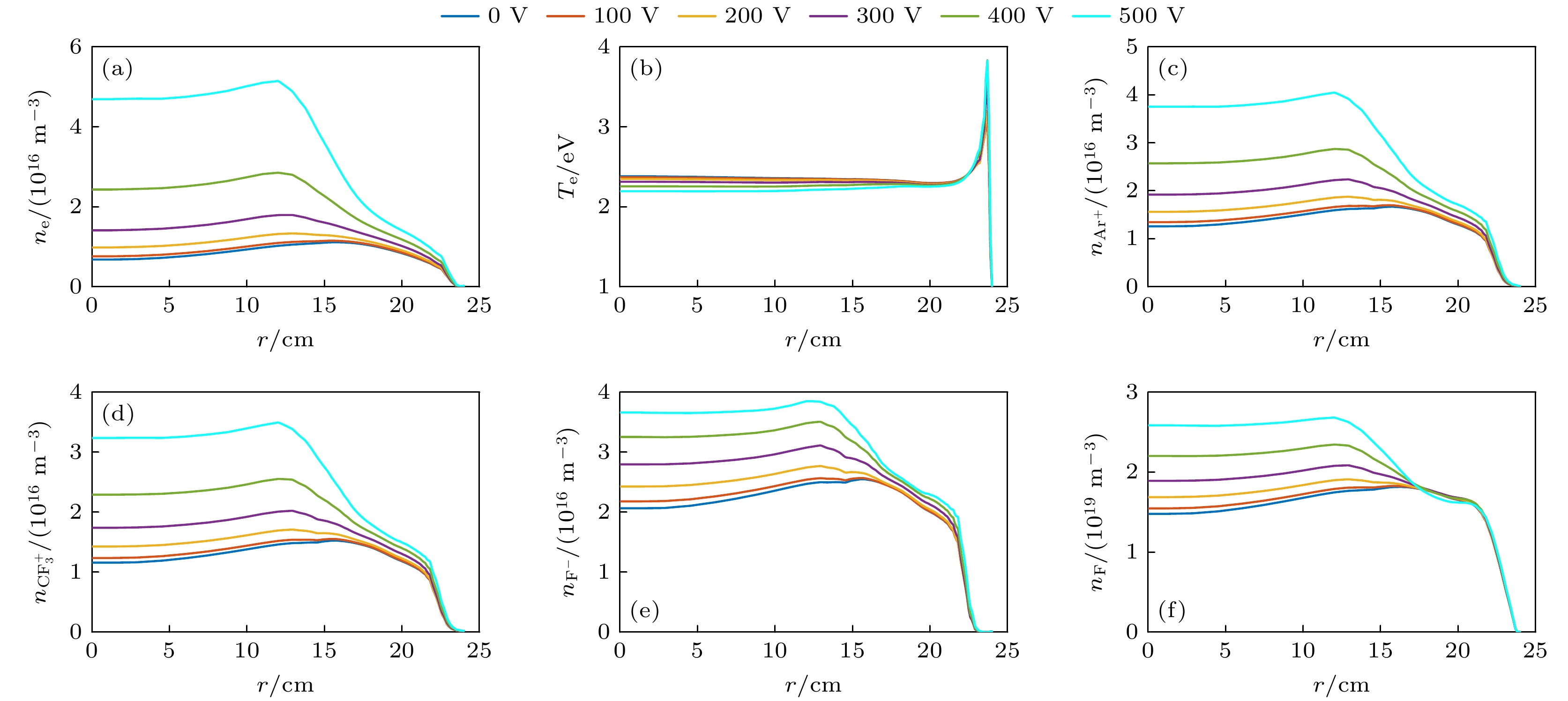 图 8 不同高频电压下(a)电子密度、(b)电子温度、(c) Ar+离子密度、(d) $\rm CF_3^+$离子密度、(e) F–离子密度、(f) F原子密度的r方向空间分布