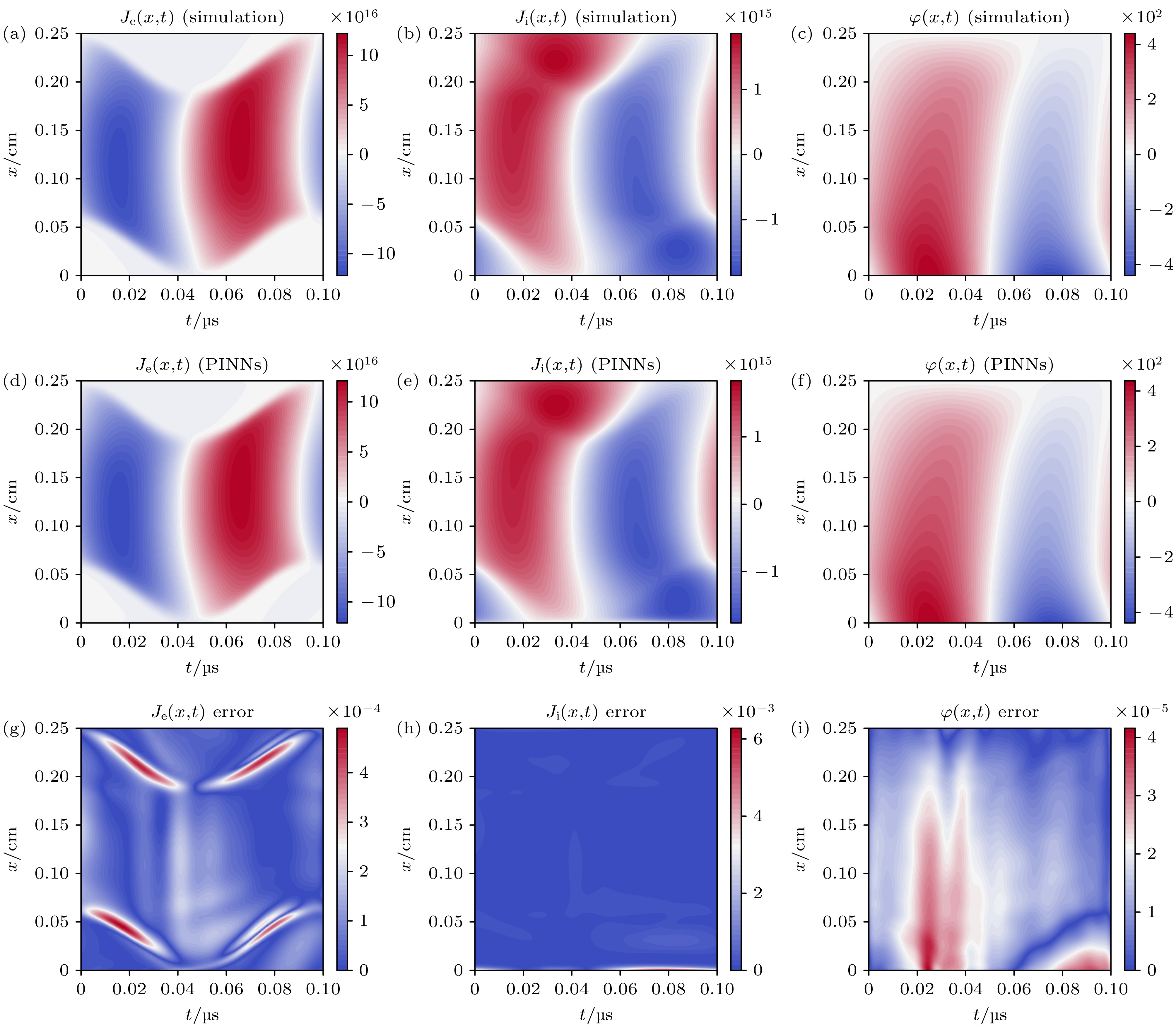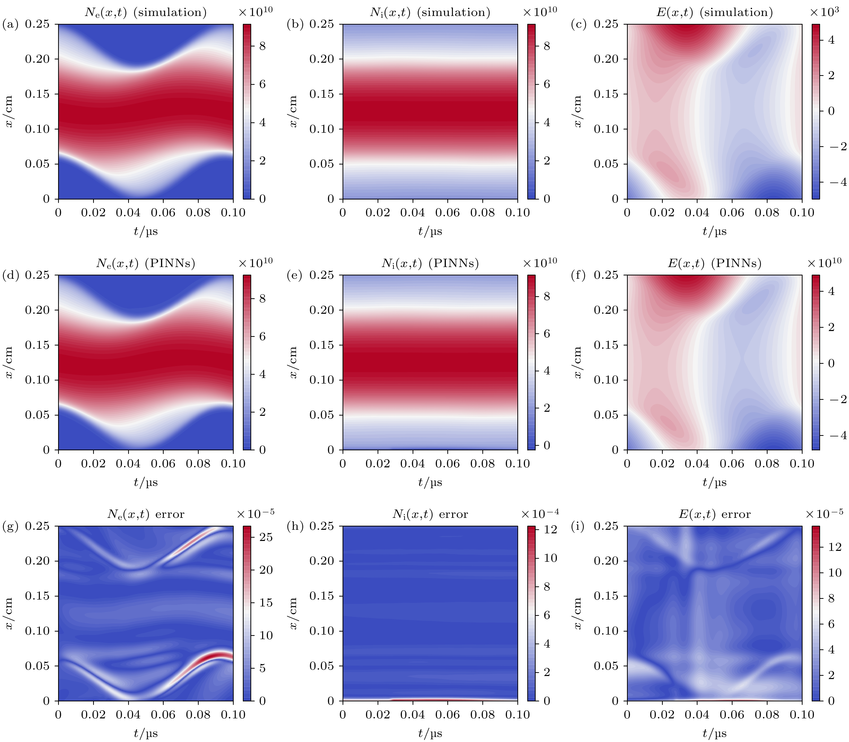 Figure 5. The comparison results of electron density, ion density and electric field intensity distribution between PINNs and traditional fluid model: (a)–(c)Numerical simulation results; (d)–(f)prediction results of PINNs; (g)–(i)error distribution.