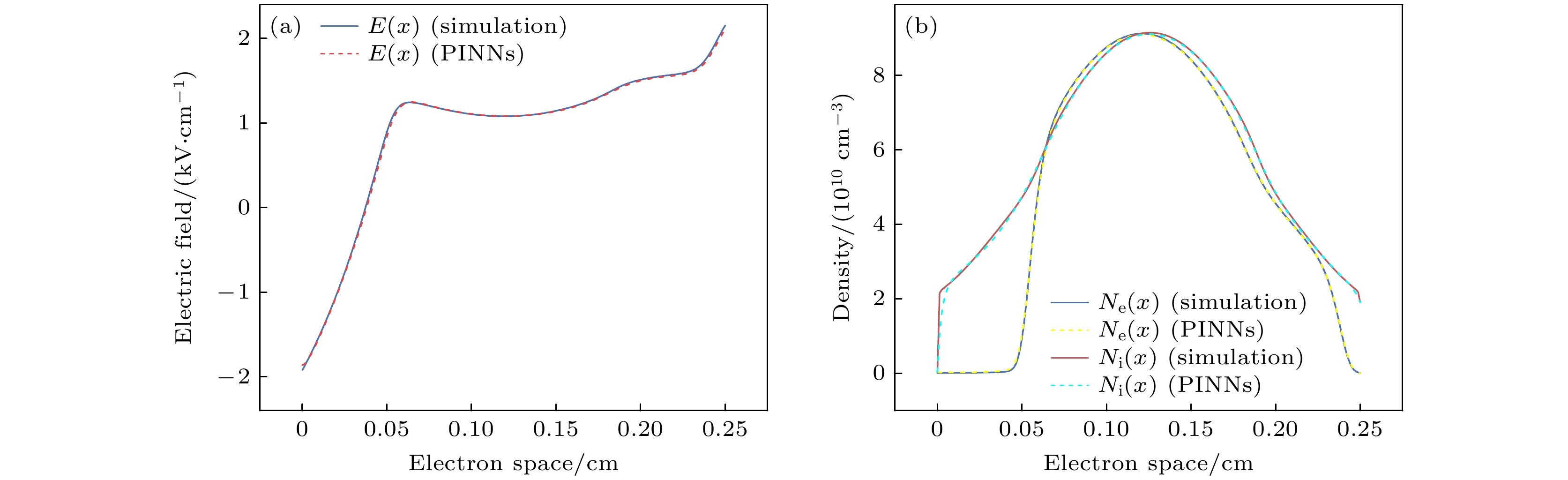 数据集 采样点位置 幅值$ {\hat V_0} $ 幅值相对误差/% 频率$ \hat f $ 频率相对误差/% 1 $E(0, t)$ 435.83 0.94811 10.046 0.46051 2 $E\left(\dfrac{1}{4}d, t\right)$ 434.03 1.3559 9.981 0.18646 3 $E\left(\dfrac{1}{2}d, t\right)$ 431.73 1.88 10.023 0.23 4 $E\left(\dfrac{3}{4}d, t\right)$ 432.65 1.67 10.015 0.15 5 $E(d, t)$ 437.01 0.68 10.010 0.099 6 $E(x, 0)$ — — — — 7 ${N_{\text{e}}}\left(\dfrac{1}{2}d, t\right) + {N_{\text{i}}}\left(\dfrac{1}{2}d, t\right)$ — — — — 表 2 在不同采样点数量条件下PINNs反演的幅值和频率