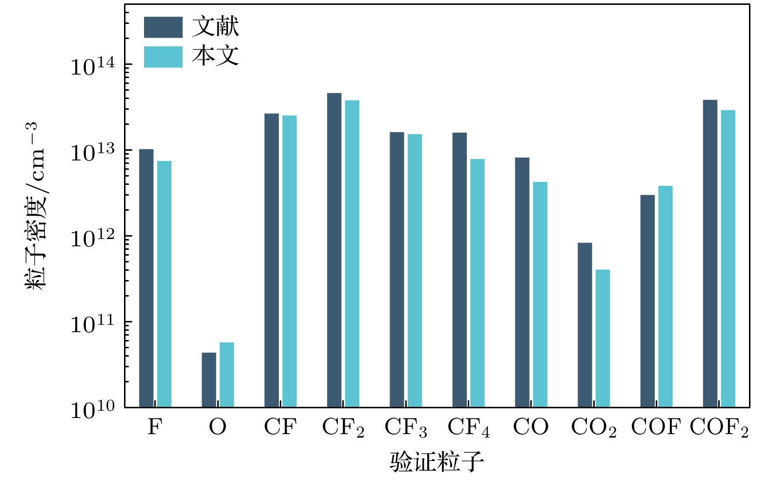 反应编号 反应式 速率系数/(cm3·s–1) 参考文献 a b c 电子碰撞反应 R1 e + C4F8 → 2C2F4 + e 9.58 × 10–8 0.042 8.572 [12] R2 e + C2F4 → 2CF2 + e 1.32 × 10–8 0.412 6.329 [12] R3 e + CF4 → CF3 + F + e 2.10 × 10–9 0.936 12.004 [35] R4 e + CF3 → CF2 + F + e 7.94 × 10–8 –0.452 12.100 [12] R5 e + CF2 → CF + F + e 1.16 × 10–8 –0.380 –14.350 [12] R6 e + CF → C + F + e 4.51 × 10–8 –0.110 8.941 [12] R7 e + F2 → 2F + e 1.08 × 10–8 –0.296 4.464 [12] R8 e + COF2 → COF + F + e 3.20 × 10–9 0.013 10.300 [36] R9 e + CO2 → CO + O + e 2.90 × 10–9 0.302 12.100 [37] R10 e + CO → C + O + e 1.54 × 10–8 0.270 14.600 [38] R11 e + O2 → 2O + e 1.71 × 10–8 –1.270 7.310 [39] R12 e + CF4 → ${\mathrm{CF}}_3^+ $ + F + 2e 2.29 × 10–8 0.680 18.304 [35] R13 e + CF3 → ${\mathrm{CF}}_2^+ $ + F + 2e 7.02 × 10–9 0.430 16.280 [12] R14 e + CF2 → CF+ + F + 2e 5.43 × 10–9 0.561 14.290 [12] R15 e + ${\mathrm{CF}}_3^+ $ → CF2 + F 6.54 × 10–8 –0.500 0.025 [13] R16 e + ${\mathrm{CF}}_2^+ $ → CF + F 6.54 × 10–8 –0.500 0.025 [13] R17 e + CF+ → C + F 6.54 × 10–8 –0.500 0.025 [13] R18 e + CF3 → ${\mathrm{CF}}_3^+ $ + 2e 1.36 × 10–9 0.796 9.057 [12] R19 e + CF2 → ${\mathrm{CF}}_2^+ $ + 2e 1.10 × 10–8 0.393 11.370 [12] R20 e + CF → CF+ + 2e 5.48 × 10–9 0.556 9.723 [12] R21 e + Ar → Ar+ + 2e 7.35 × 10–8 0.208 19.100 [40] 电荷交换反应 R22 $ {\mathrm{CF}}_2^+$ + CF → ${\mathrm{CF}}_3^+ $ + C 2.06 × 10–9 0 0 [13] R23 ${\mathrm{CF}}_2^+ $ + C → CF+ + CF 1.04 × 10–9 0 0 [13] R24 CF+ + CF3 → ${\mathrm{CF}}_3^+ $ + CF 1.71 × 10–9 0 0 [13] R25 CF+ + CF2 → ${\mathrm{CF}}_2^+ $ + CF 1.00 × 10–9 0 0 [13] R26 Ar+ + CF4 → ${\mathrm{CF}}_3^+ $ + F + Ar 4.80 × 10–10 0 0 [13] R27 Ar+ + CF3 → ${\mathrm{CF}}_2^+ $ + F + Ar 5.00 × 10–10 0 0 [13] R28 Ar+ + CF2 → CF+ + F + Ar 5.00 × 10–10 0 0 [13] 氧化反应 R29 CF3 + O → COF2 + F 3.30 × 10–11 0 0 [13] R30 CF2 + O → COF + F 3.10 × 10–11 0 0 [13] R31 CF + O → CO + F 6.60 × 10–11 0 0 [13] R32 COF + O → CO2 + F 9.30 × 10–11 0 0 [13] R33 COF + COF → COF2 + CO 1.00 × 10–11 0 0 [13] R34 C + CO2 → 2CO 1.00 × 10–15 0 0 [41] R35 COF + CF3 → COF2 + CF2 1.00 × 10–11 0 0 [13] R36 COF + CF2 → COF2 + CF 3.00 × 10–13 0 0 [13] R37 COF + CF3 → CO + CF4 1.00 × 10–11 0 0 [13] R38 COF + CF2 → CO + CF3 3.00 × 10–13 0 0 [13] 重组反应 R39 F + CF3 → CF4 2.00 × 10–11 0 0 [13] R40 F + CF2 → CF3 1.80 × 10–11 0 0 [13] R41 F + CF → CF2 9.96 × 10–11 0 0 [13] R42 F2 + CF3 → CF4 + F 1.90 × 10–14 0 0 [13] R43 F2 + CF2 → CF3 + F 8.30 × 10–14 0 0 [13] 表 A2 表面反应集
