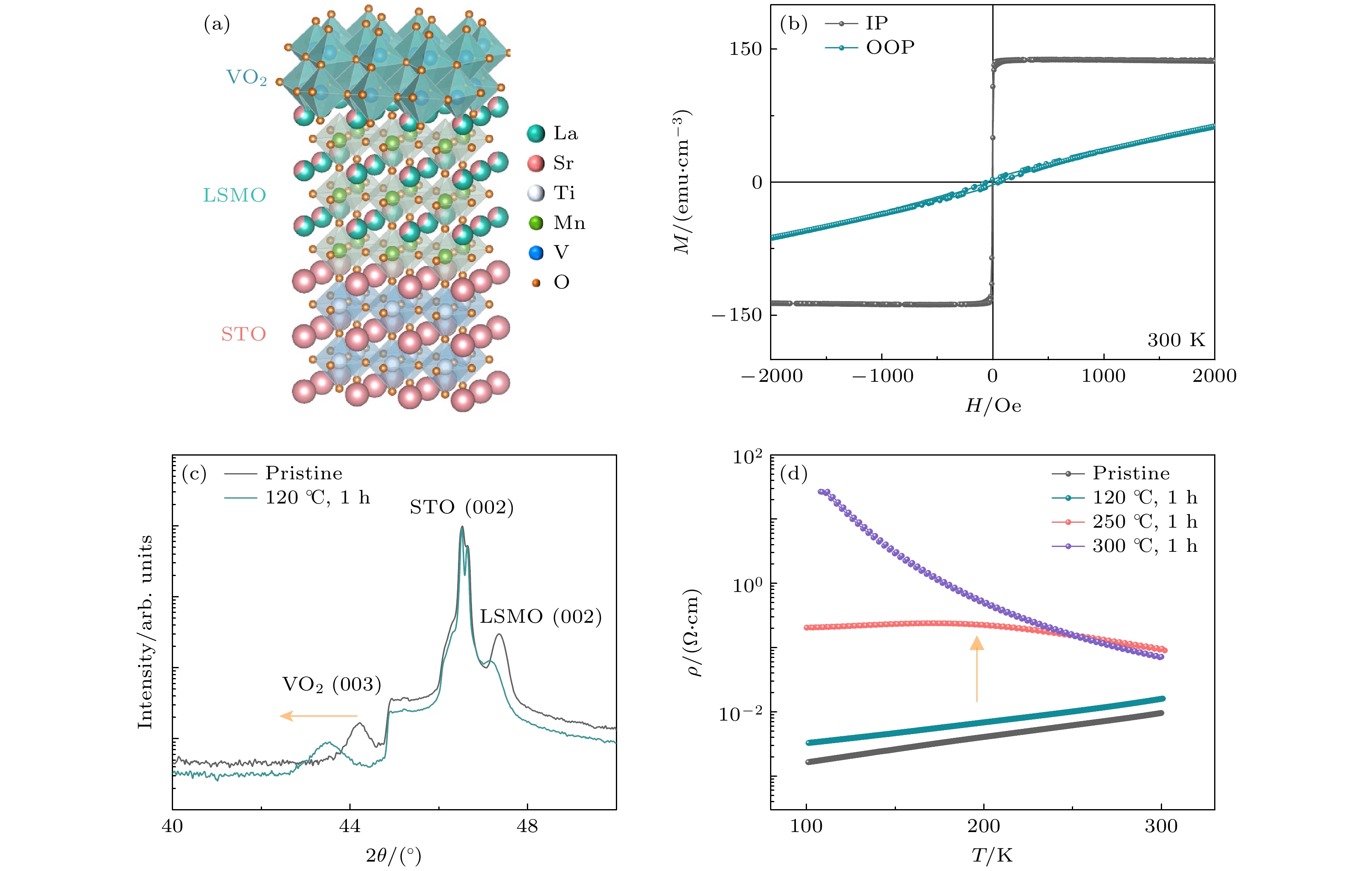 图 1 氢离子触发VO2 (B)/LSMO异质结的结构演化和电子相变 (a) VO2(B)/LSMO/STO异质结的晶体结构示意图; (b) VO2(B)/LSMO薄膜的室温磁滞回线; (c) 原始VO2(B)/LSMO样品及氢化后样品的XRD图谱对比; (d) 原始VO2(B)/LSMO样品及不同氢化条件下样品阻温特性曲线(ρ-T曲线)