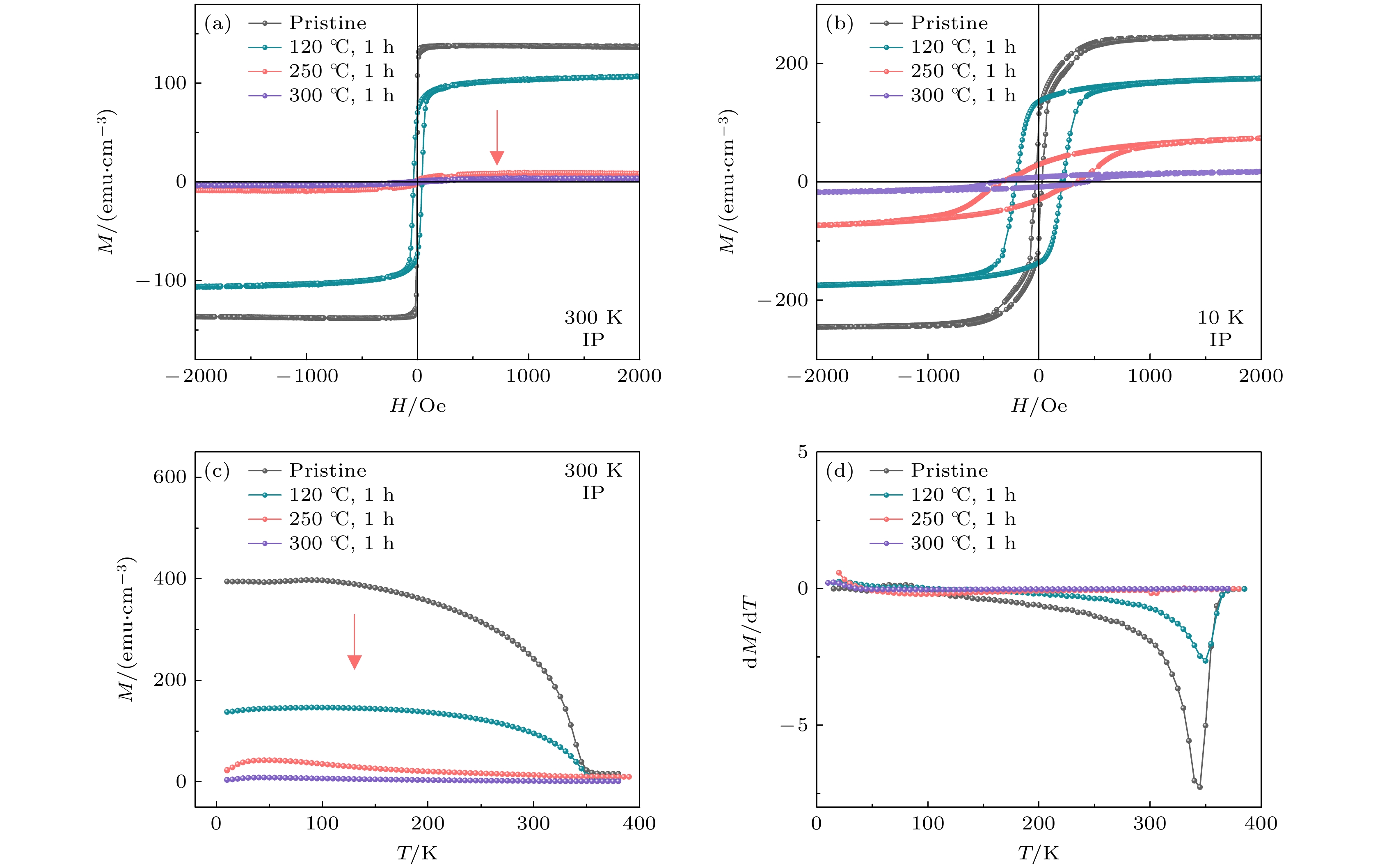 图 2 氢离子掺杂调控VO2(B)/LSMO异质结的磁学特性 (a) 室温原始与氢化VO2(B)/LSMO异质结面内磁滞回线的对比; (b) 在10 K下的原始与氢化VO2(B)/LSMO异质结的面内磁滞回线对比; (c) 在300 Oe磁场下, VO2(B)/LSMO异质结磁化强度随温度的变化关系图; (d) VO2(B)/LSMO异质结的dM/dT随温度变化曲线