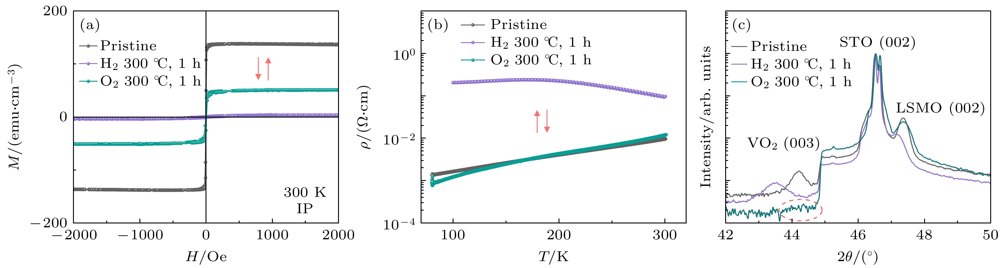 图 3 氢化触发VO2(B)/LSMO异质结可逆的磁电相变 (a) 氢化与去氢化VO2(B)/LSMO的磁滞回线对比; (b) 氢化与去氢化VO2(B)/LSMO的电阻率-温度(ρ-T)图对比; (c) 氢化与去氢化VO2(B)/LSMO的XRD图对比