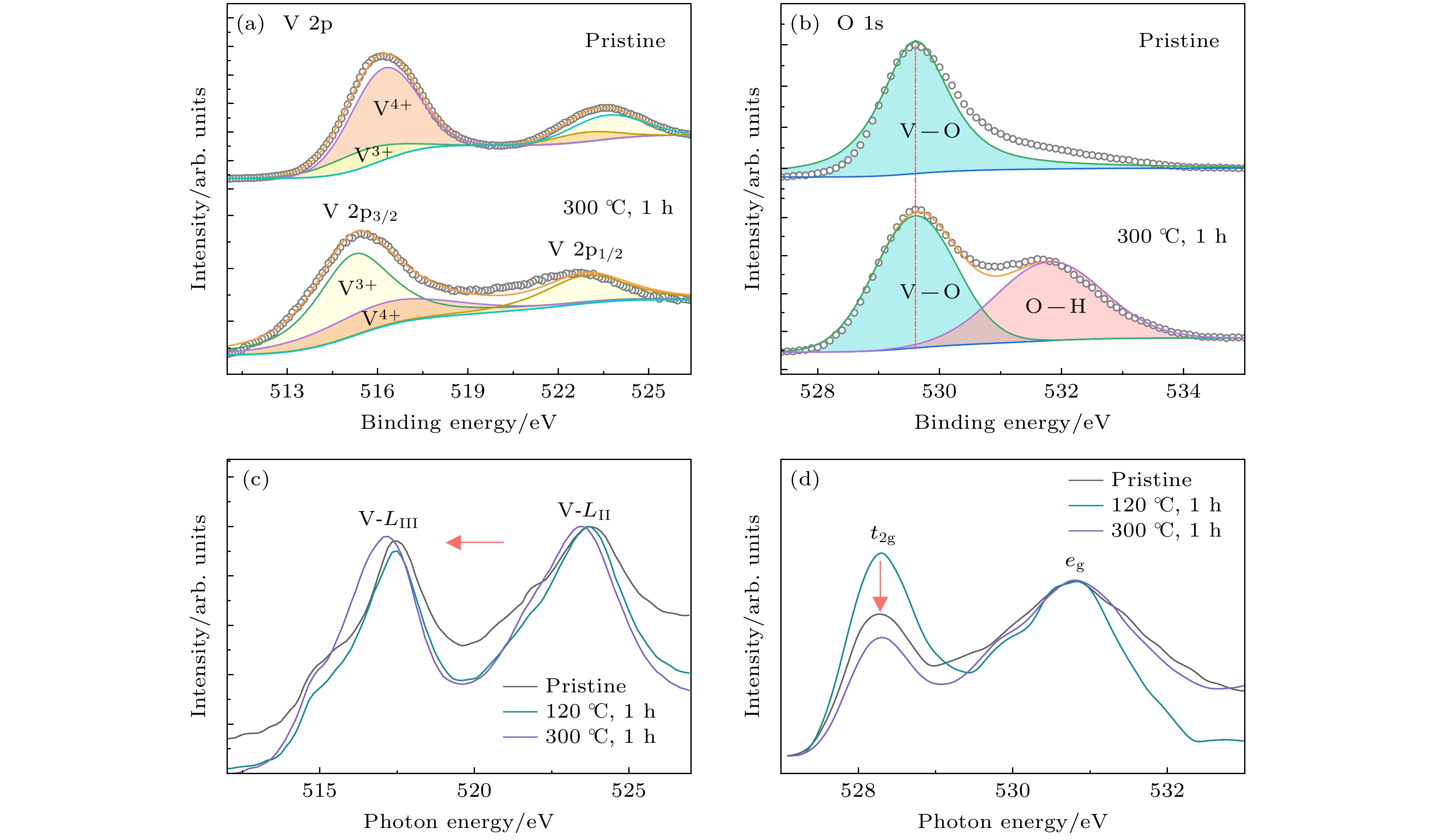 图 4 氢化对VO2(B)/LSMO异质结化学环境与电子结构的调制作用 (a), (b) 氢化前后VO2(B)/LSMO异质结的X射线光电子能谱(XPS); (a) V-2p核心能级; (b) O-1s核心能级; (c), (d) 氢化前后VO2(B)/LSMO异质结的同步辐射软X射线吸收谱(sXAS); (c) V-L边; (d) O-K边