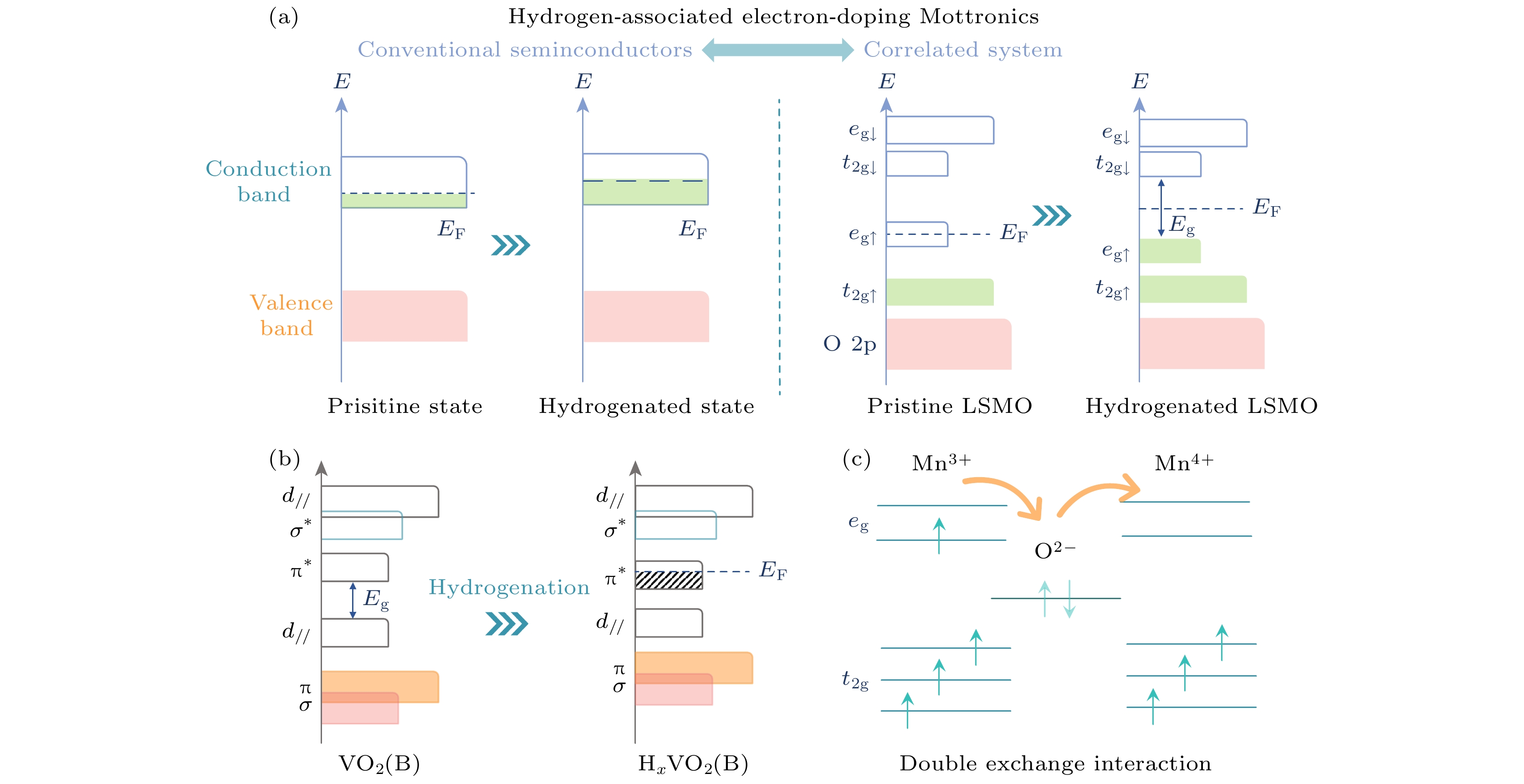 图 5 氢化诱导VO2(B)/LSMO磁电相变 (a) 传统半导体与关联材料氢致电子相变示意图; (b) 氢化调控VO2(B)电子轨道构型变化的示意图; (c) 氢化抑制LSMO中Mn3+-Mn4+双交换相互作用的示意图