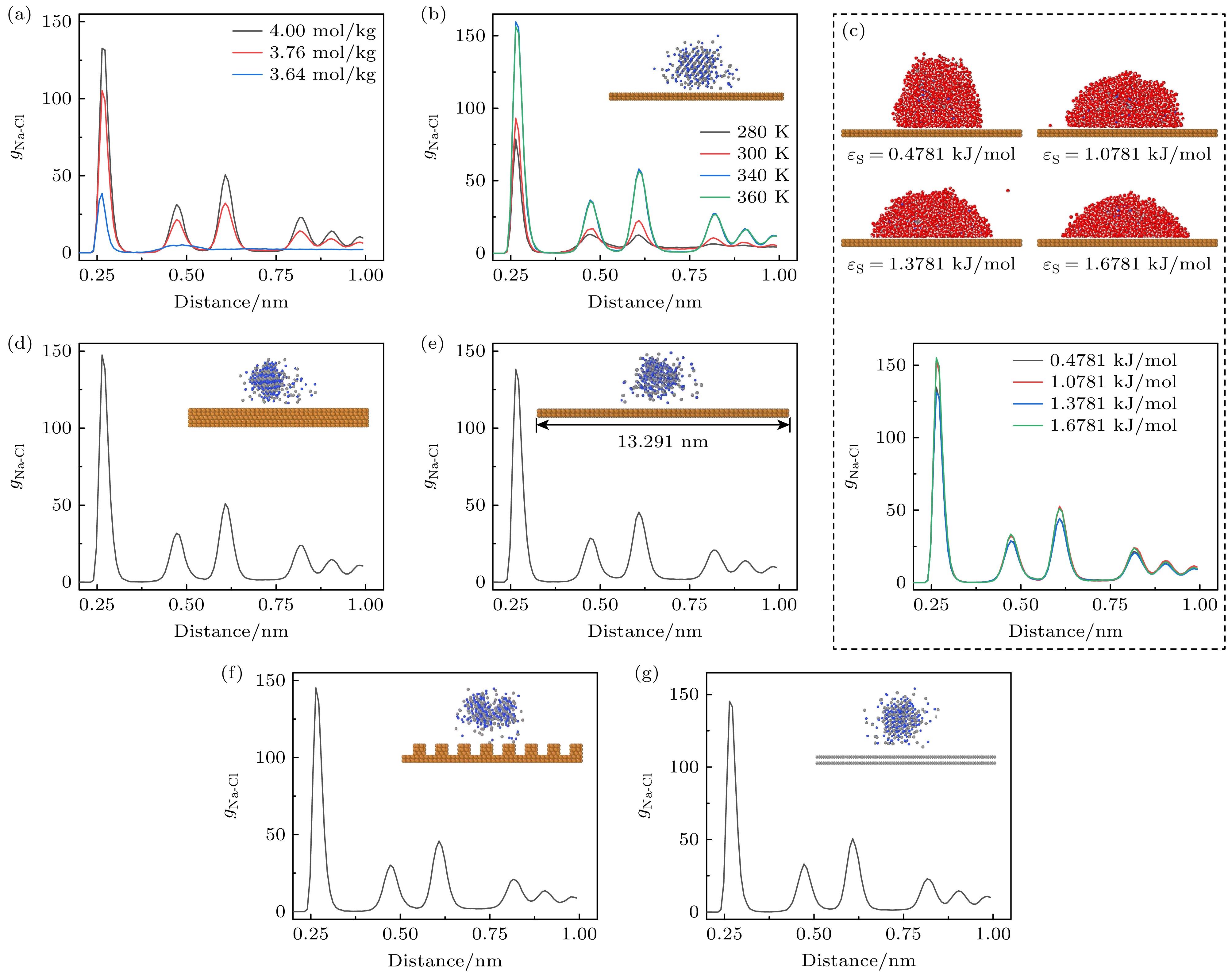 图 2 纳米液滴在不同条件下的结晶行为 (a) 浓度分别为4.00, 3.76和3.64 mol/kg氯化钠液滴中离子的RDF; (b) 在280, 300, 340和360 K下, 氯化钠溶液中得到的晶体的RDF, 插图为300 K下结晶的侧视图; (c) 在不同势能参数的原子构成的固体上, 液滴中出现的晶体对应的RDF; (d) 增大固体厚度至0.835 nm后, 氯化钠液滴中得到的晶体的RDF; (e) 增大固体xy方向的尺寸至13.281 nm×13.291 nm后形成的晶体的RDF; (f) 增加固体表面纳米结构(沟道在x方向的宽度为0.89 nm, y方向的宽度为0.77 nm)后形成的晶体的RDF; (g) 双层石墨烯(尺寸为10.226 nm×10.332 nm)表面氯化钠液滴中形成的晶体的RDF