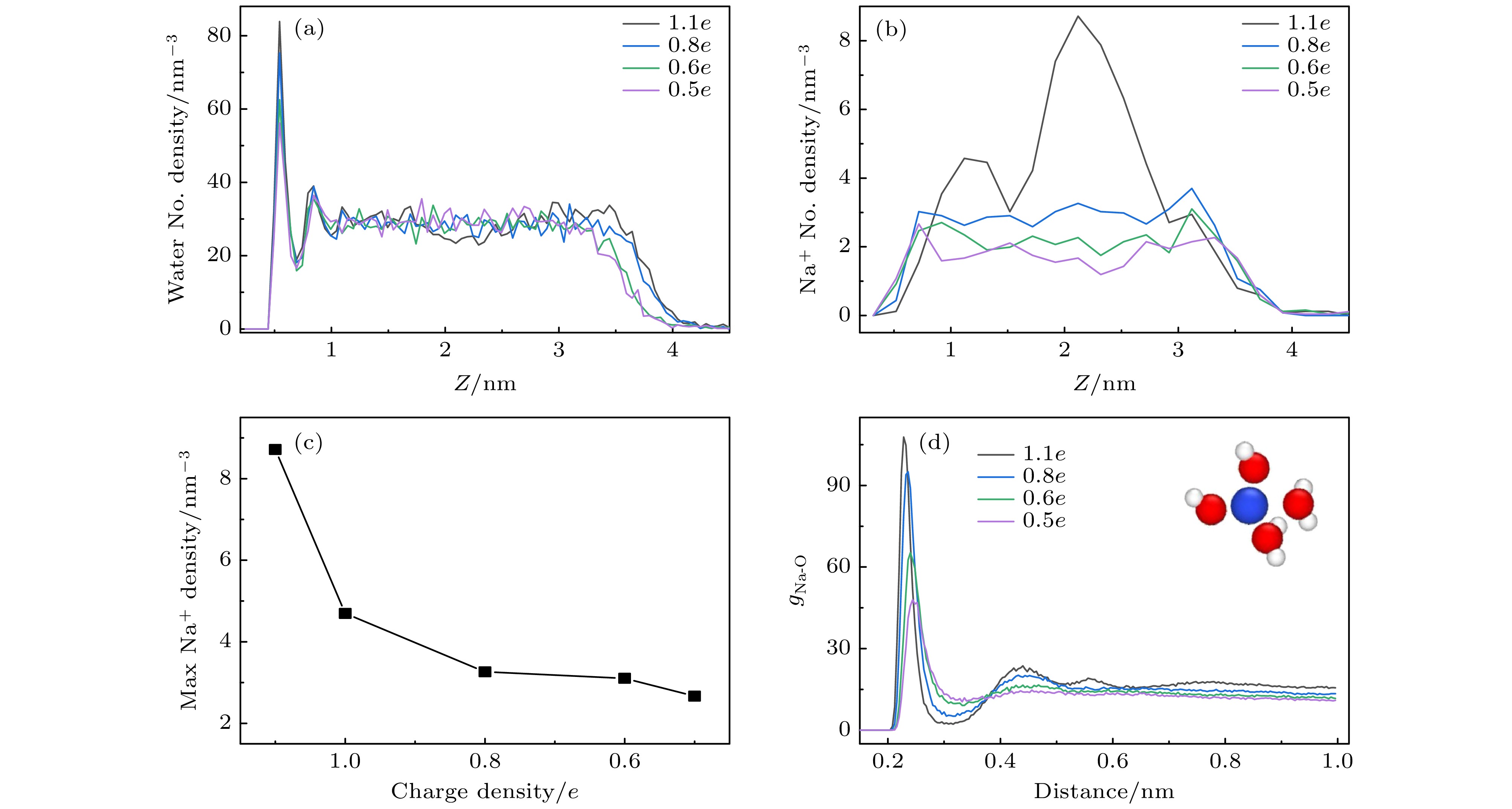 图 4 改变离子电荷密度后, 水分子(a)和钠离子(b)在竖直方向的空间分布, 对于液滴内部的离子而言, 其数密度随着电荷密度的增大而增大; (c) 液滴中离子浓度最大值随钠离子电荷密度的变化; (d) 钠离子-水分子(以氧原子代替)的径向分布函数, 插图为水分子在钠离子周围的分布图