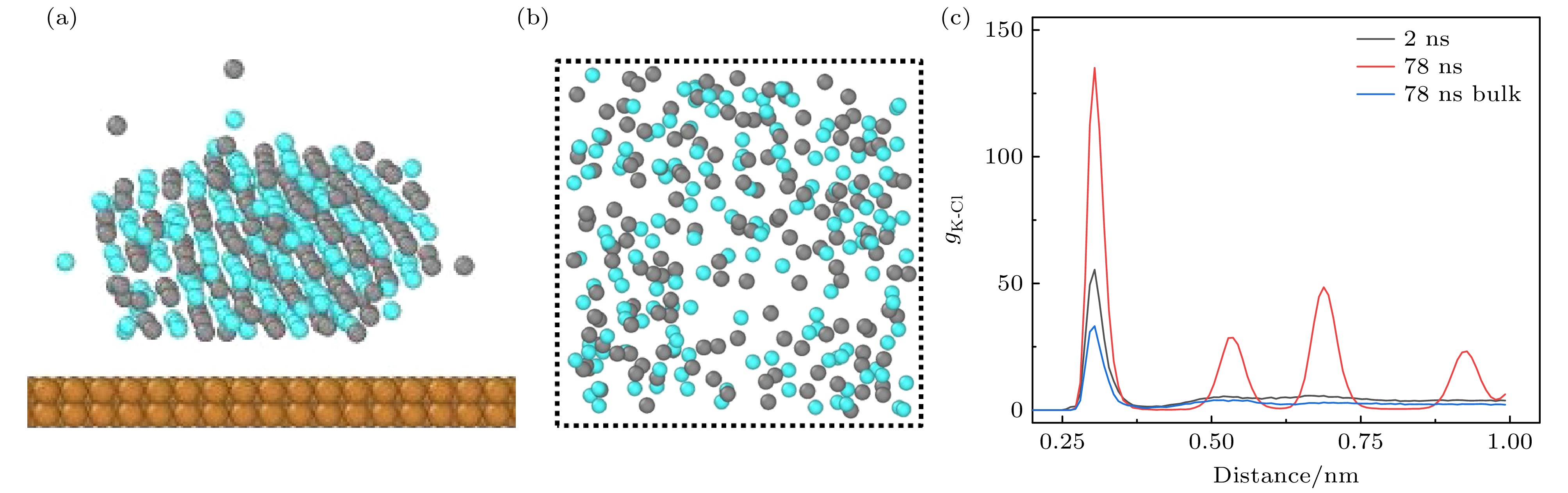 Figure 5. Comparison of the crystallization in the nano-droplet KCl solution on the solid and that in the bulk KCl solution: (a) The side view of ions in the nano-droplet of KCl solution on solid surface, the cyan spheres denote potassium ions; (b) bulk solution with the same concentration of 5.50 mol/kg, the dashed line means the periodic boundary; (c) the RDF of ions in the nano-droplet on solid at 2 ns (black) and 78 ns (red), compared to that in the bulk solution at 78 ns (blue).