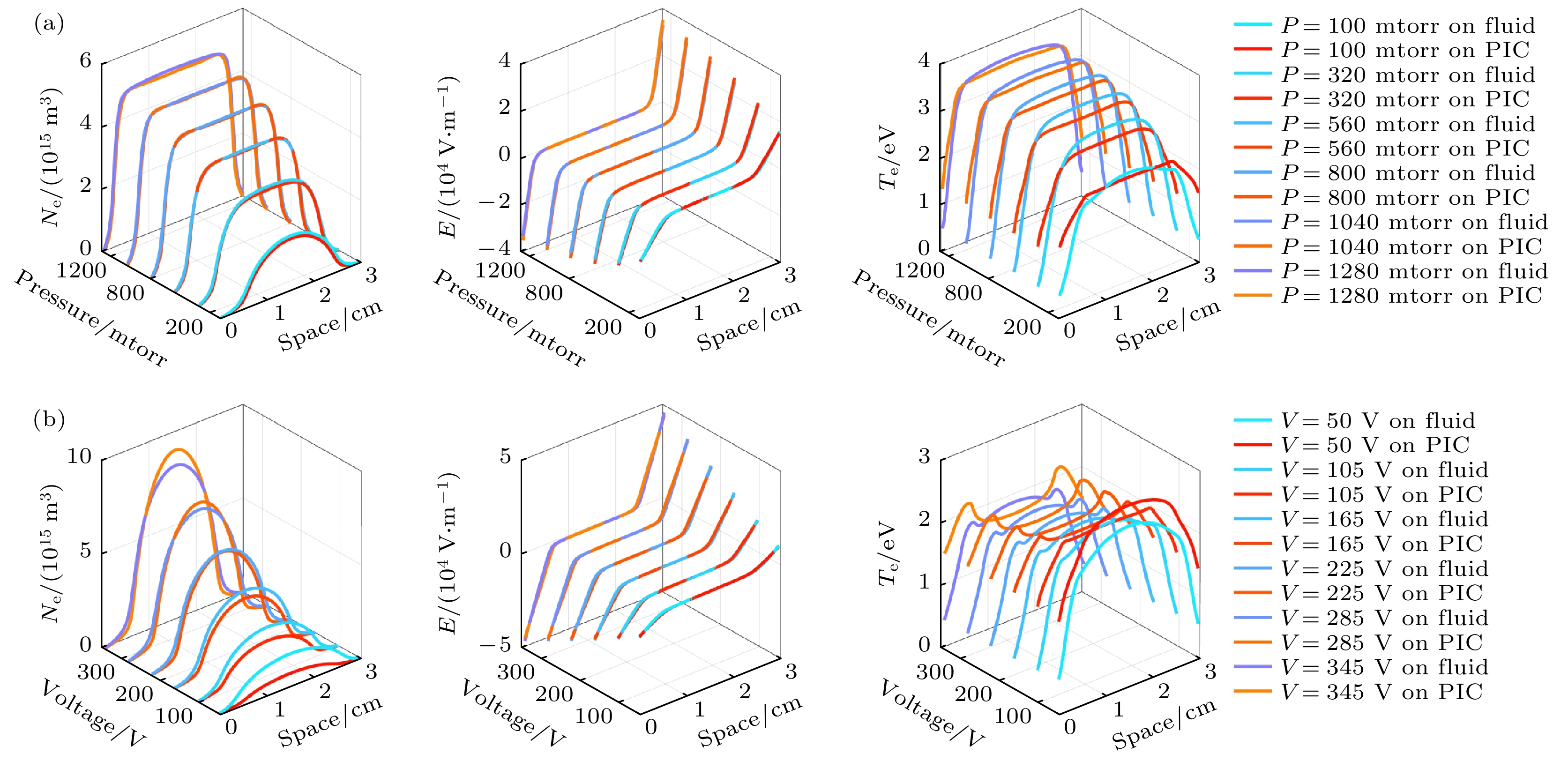 Figure 2. Time-averaged spatial profiles of electron density, electric field, and temperature under scans of (a) gas pressure and (b) driving voltage, used for dataset generation. The red-colored series represents fluid model simulation results, while the blue-colored series represents PIC model results.